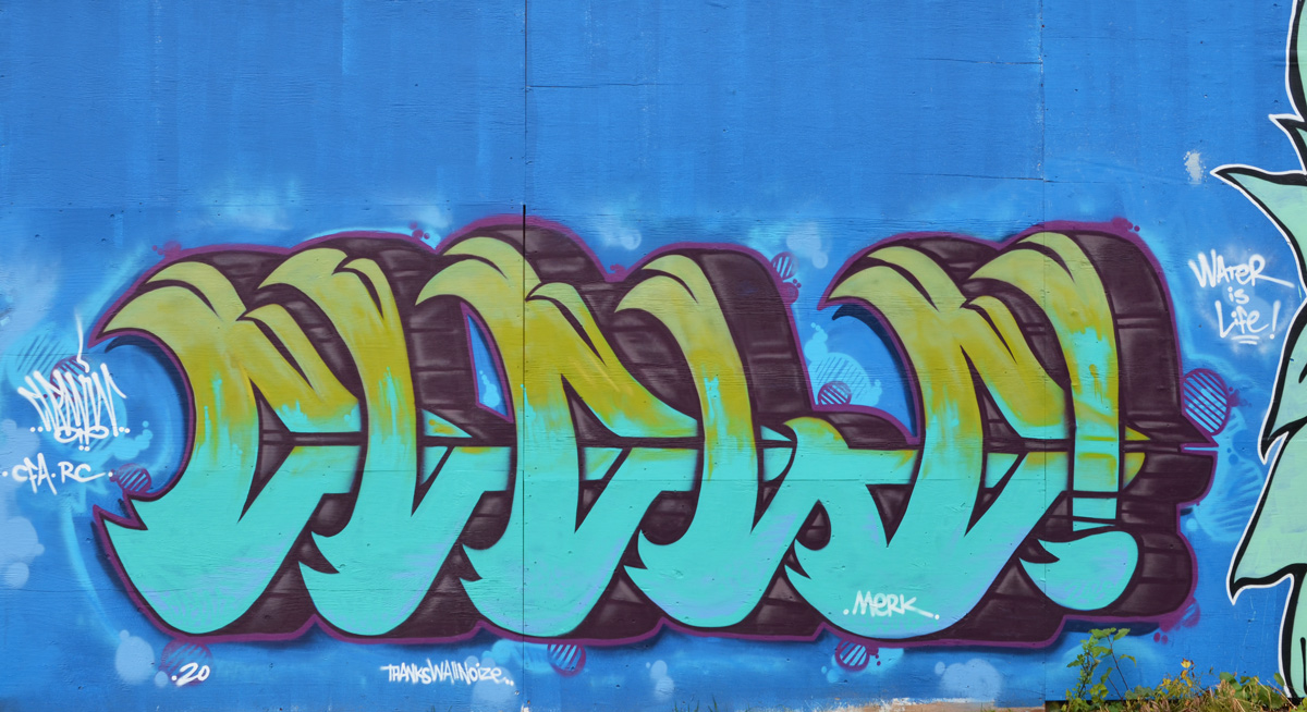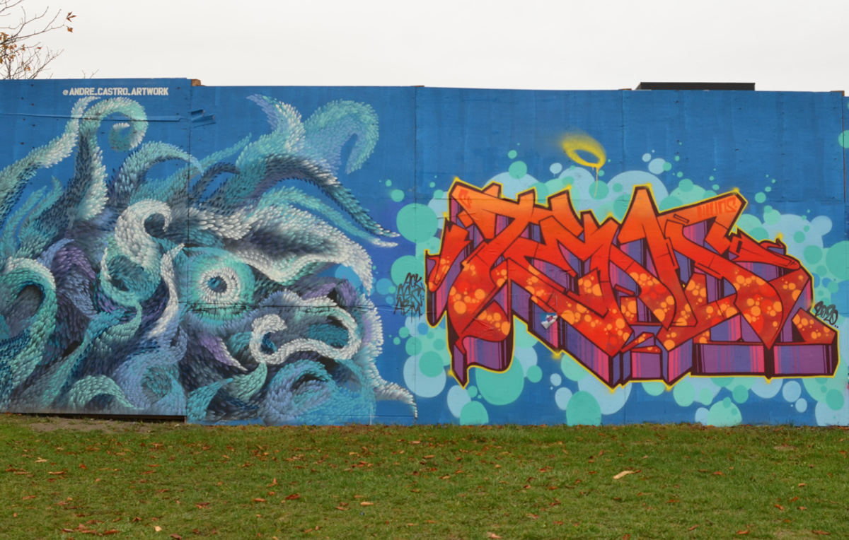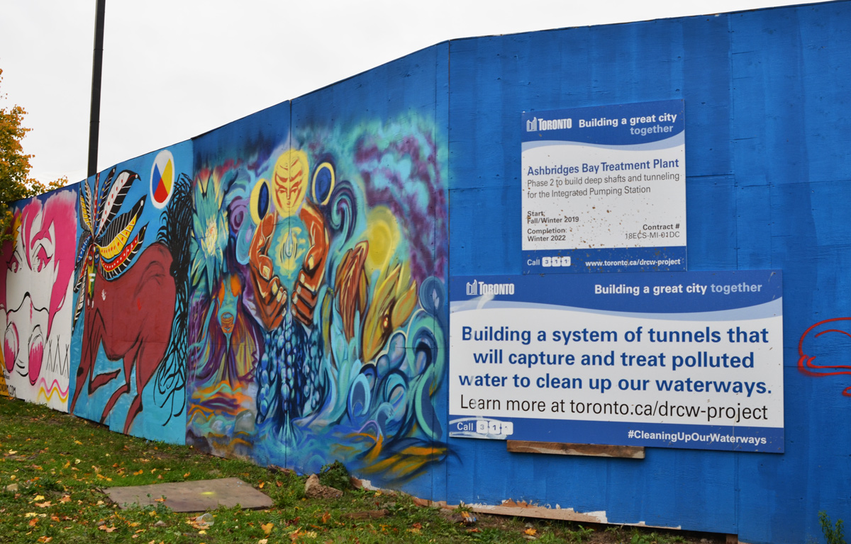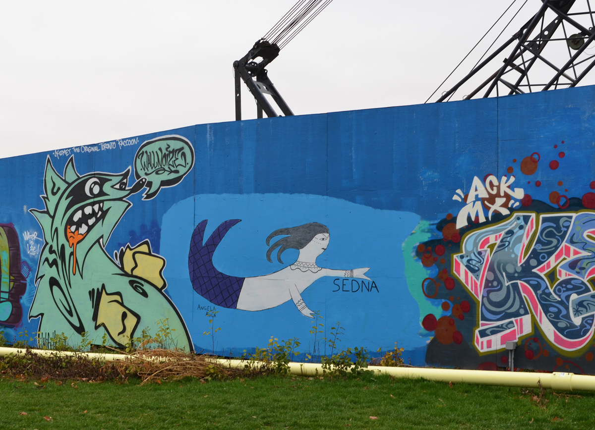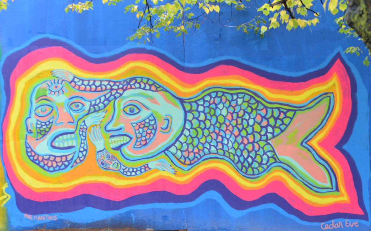 The blues of the water, the Humber River, were painted by Kwest. Water is the Underworld in Ahishinaabe cosmology and the Guardians of this Underworld are the fish. Another artist, Jarus aka (Emmanuel Jarus), painted the fish.