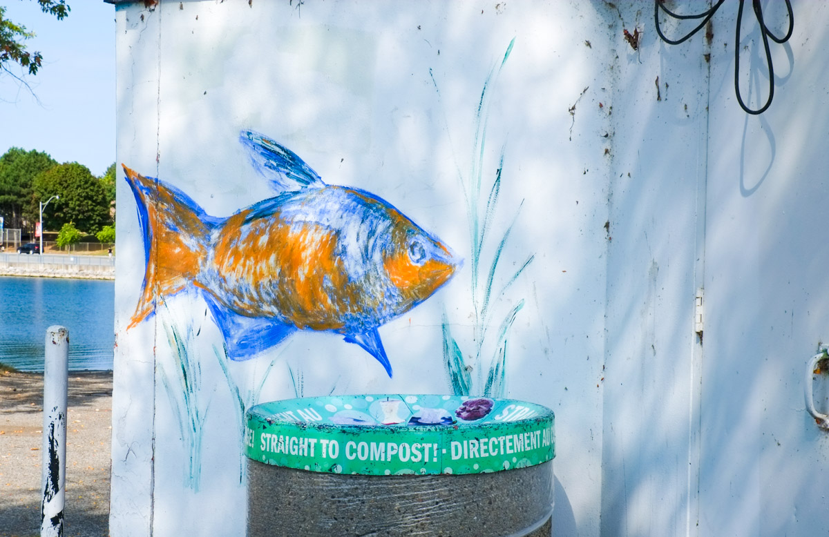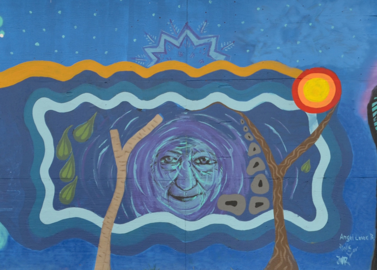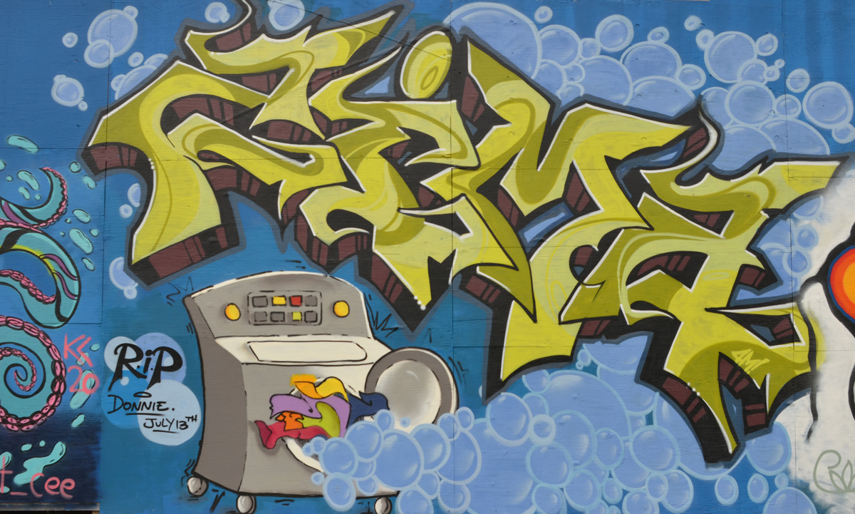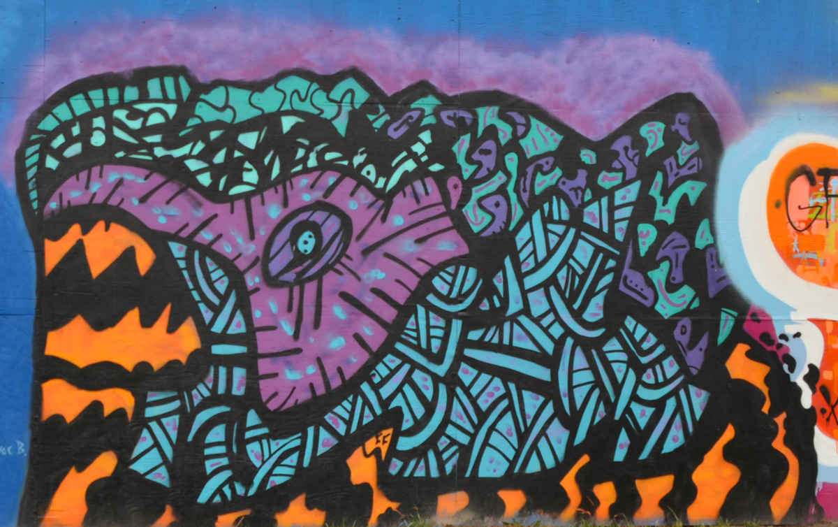 The blues of the water, the Humber River, were painted by Kwest. Water is the Underworld in Ahishinaabe cosmology and the Guardians of this Underworld are the fish. Another artist, Jarus aka (Emmanuel Jarus), painted the fish.