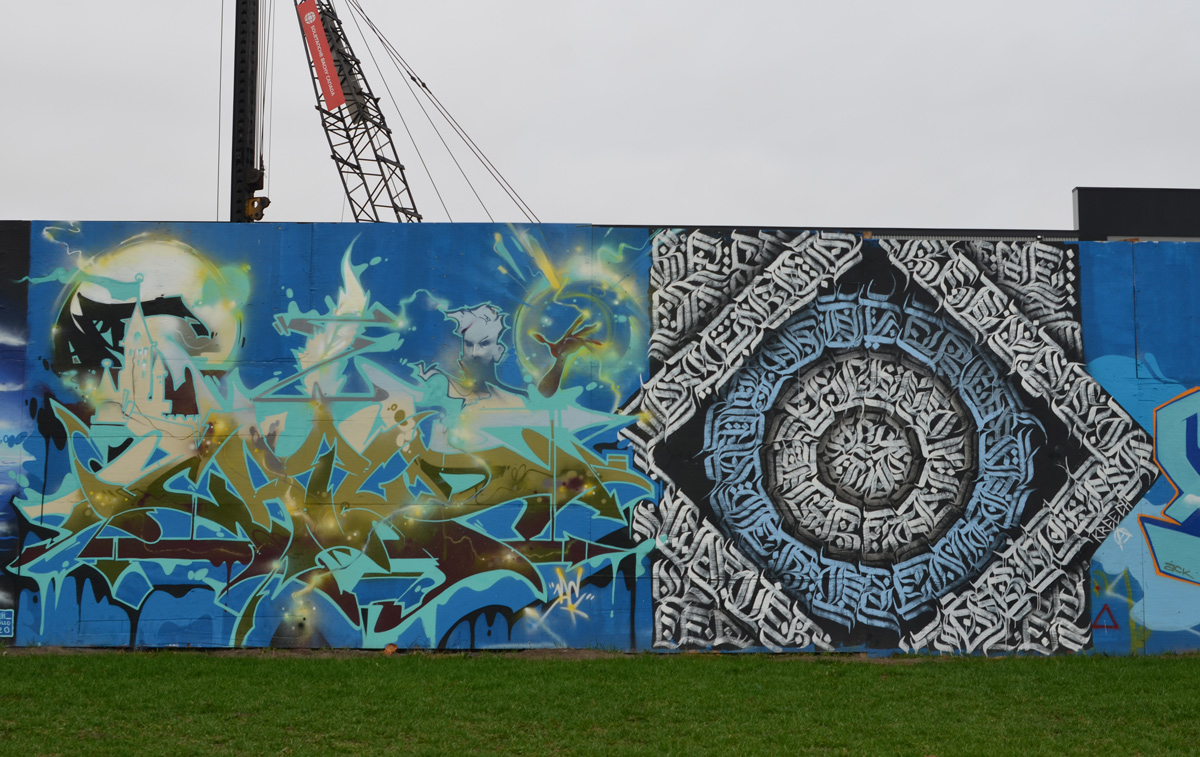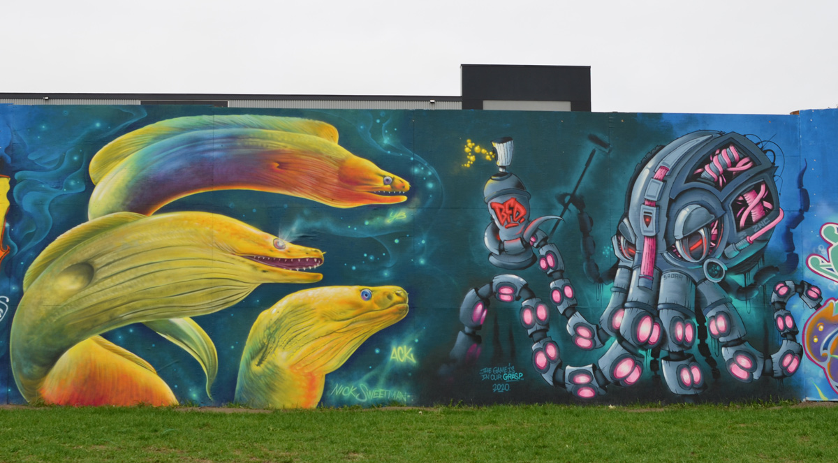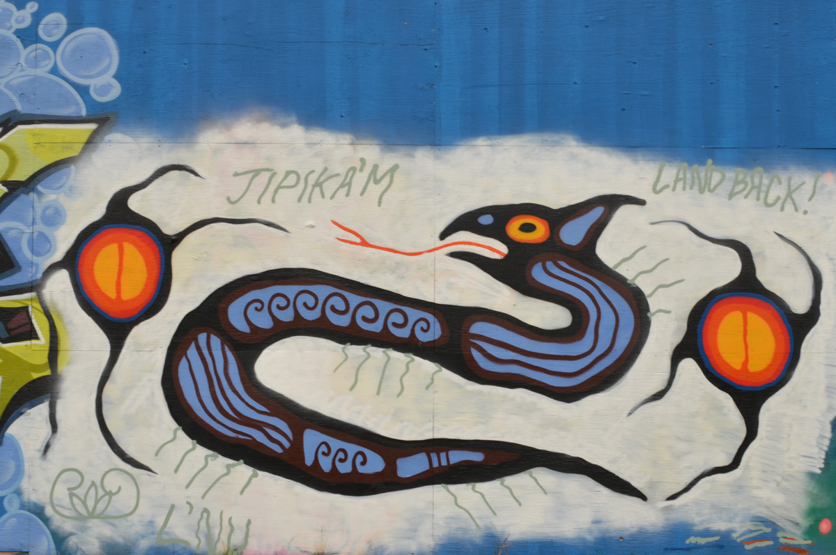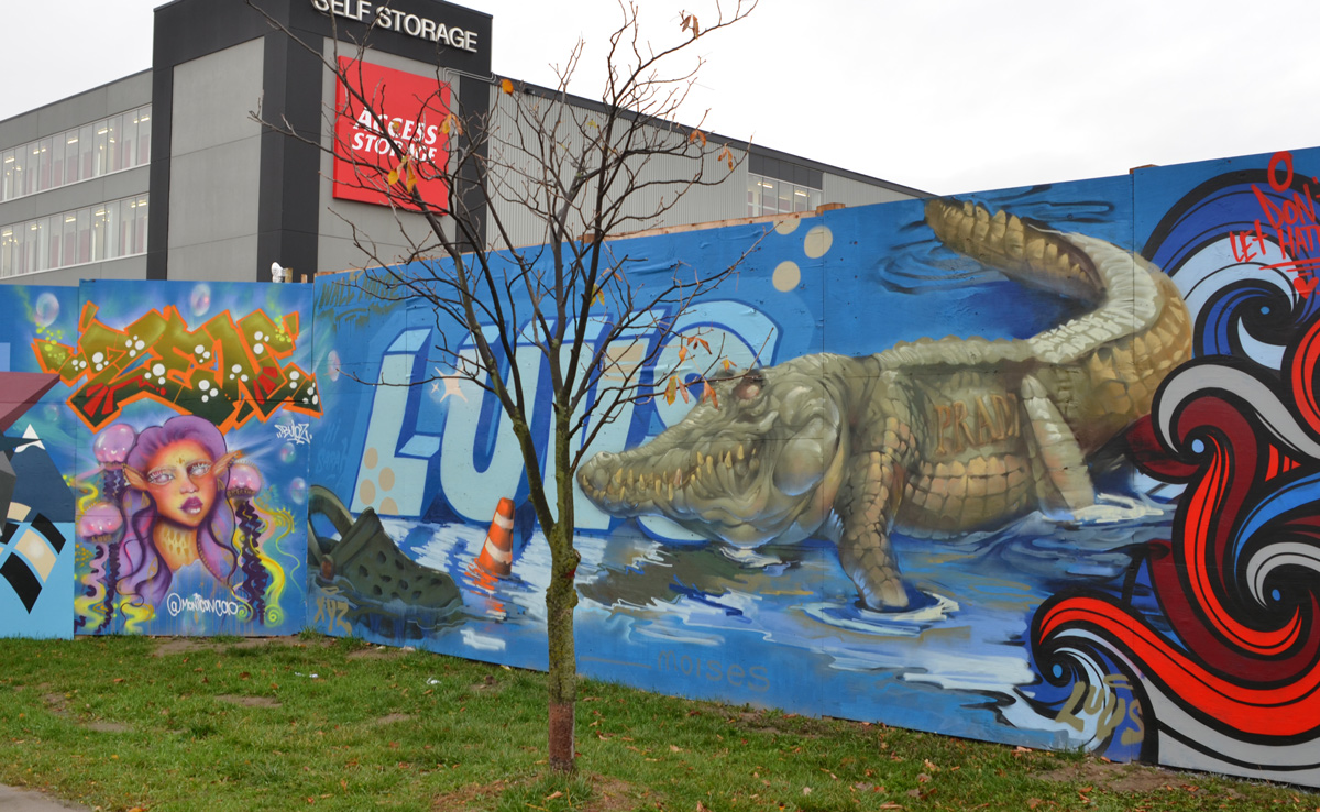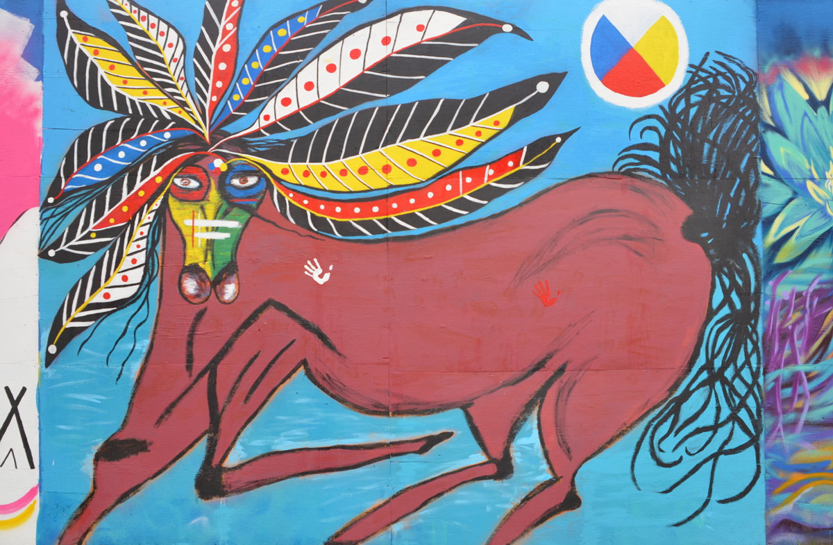 The blues of the water, the Humber River, were painted by Kwest. Water is the Underworld in Ahishinaabe cosmology and the Guardians of this Underworld are the fish. Another artist, Jarus aka (Emmanuel Jarus), painted the fish.
