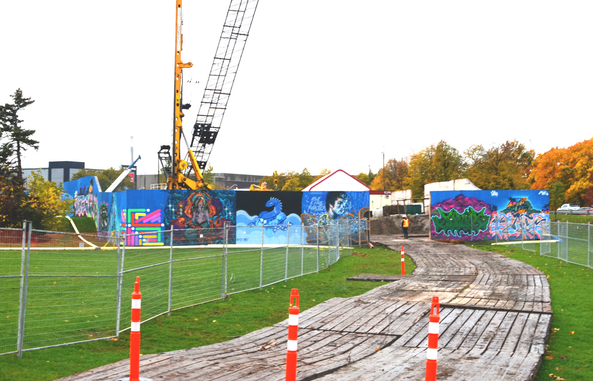 below: Part of art installation “High Water Mark” by Robert Sprachman that is almost complete. There are 15 rocks each with a year on them. The height of the rock on a metal pole represents the height of the flood water on the Don River that year (but is not an exact height). There are four rocks in this picture and from left to right are 1926, 1934, 1942, and obscured (the last is behind the wood. Ooops).