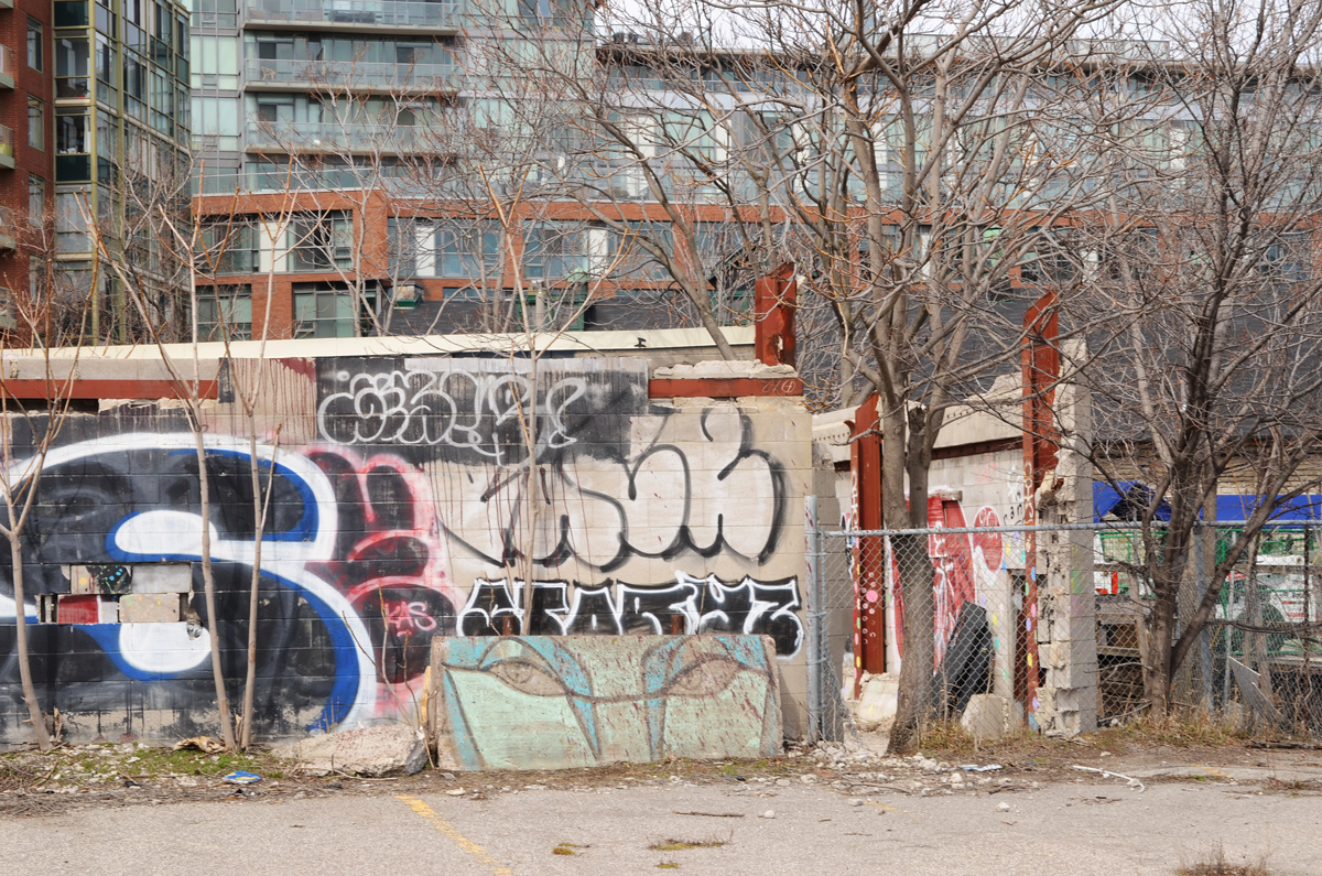 below: From Exhibition station east towards the city centre, north side. A new street that parallels the railway tracks is being built here. If the plans are correct, the new street will connect Strachan Ave in the east with Dufferin St in the west.