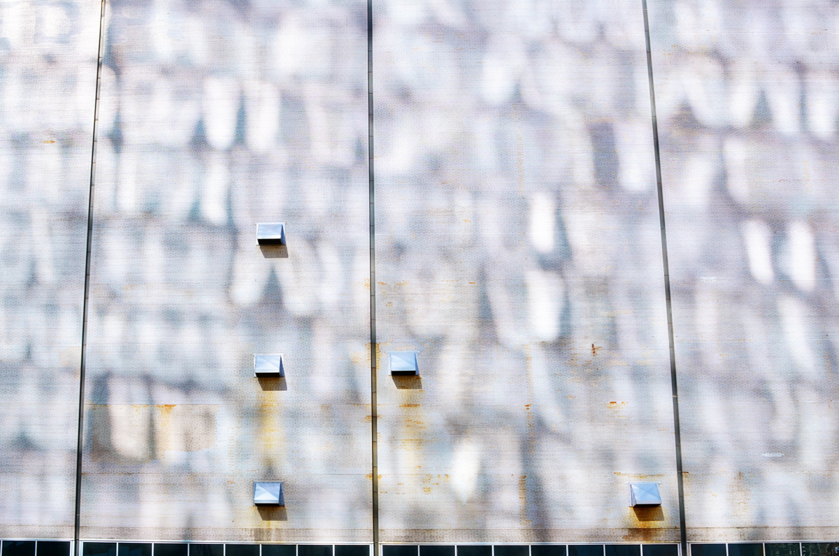 below: Artwork on the roof of the Better Living Centre is a three dimensional grid of steel with different coloured plexiglass panels in some of the squares.