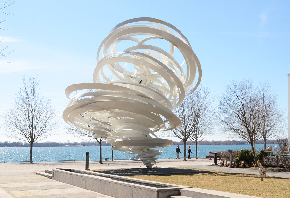 below: The artist, Philip Cote, described the story behind this image on the ArtworxTO website (see link); like all cultures, the Anishinaabe have an origin story. In the beginning there was just Spirit. “And that spirit decided to send signals out into the universe and waited for a response. And when no response happened that spirit called the signals back and said, “As you come back to me, create light in the universe”. And at that moment they had light and dark in the universe. And that is the beginning of the Anishinaabe cosmology. Everything for Anishinaabe is made of light and dark. Everything we look at has a spirit, everything, the ground, the rocks, the sand, the trees, the birds, the plants, everything is… and even our sun and our Mother Earth and the moon, they all have a spirit.”