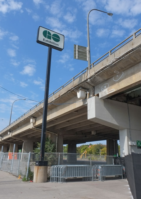 After walking through the tunnel under the tracks at Exhibition GO station, you emerge under the Gardiner Expressway, right beside the Exhibition grounds. …. And so begins Part 2. A quick note – when Metrolinx describes Exhibition station on the Ontario Line, they usually add “Ontario Place” to it, i.e. it’s Exhibition/Ontario Place station.