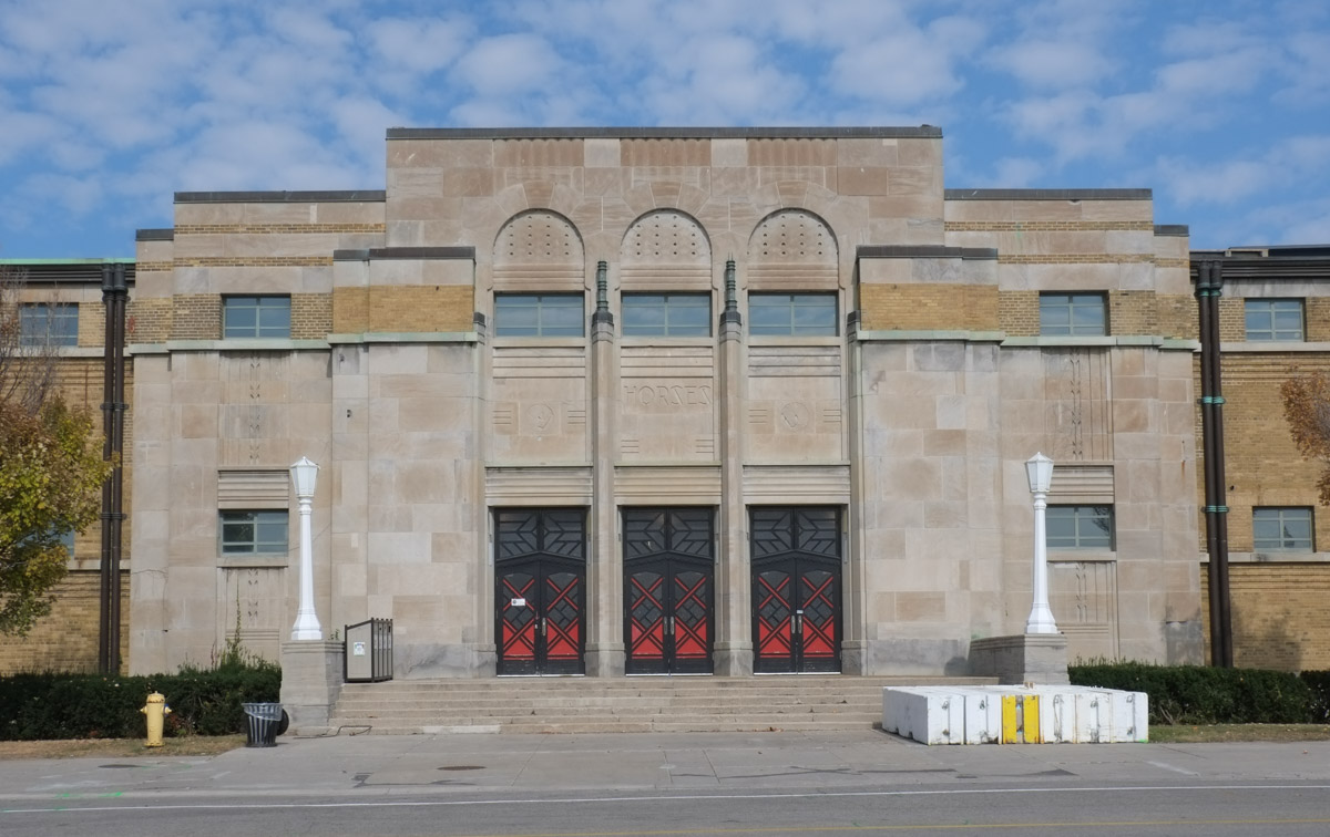 below: South entrance of the Horse Palace. Three levels of government contributed to the construction of this building which opened in 1931. It is two storeys high and covers 4 acres. Originally it accommodated 1200 horses. Today it is home to Toronto’s mounted police unit.