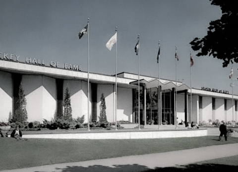 below: The Hockey Hall of Fame building (1961-1993) at the Exhibition. The mural is behind the glass in the entrance way.