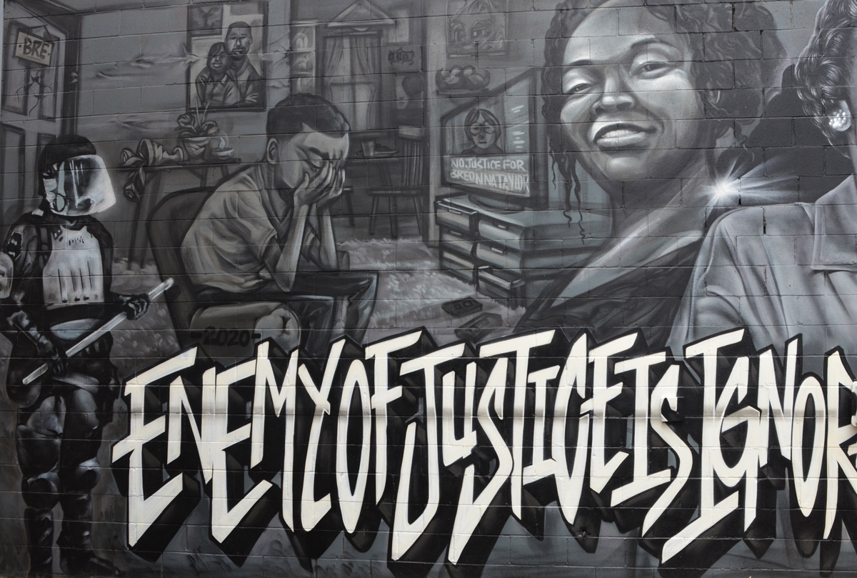 below: After the green god, is a more somber toned mural with the words, 1752, Mi’kmaq Nation, Take care of the water.