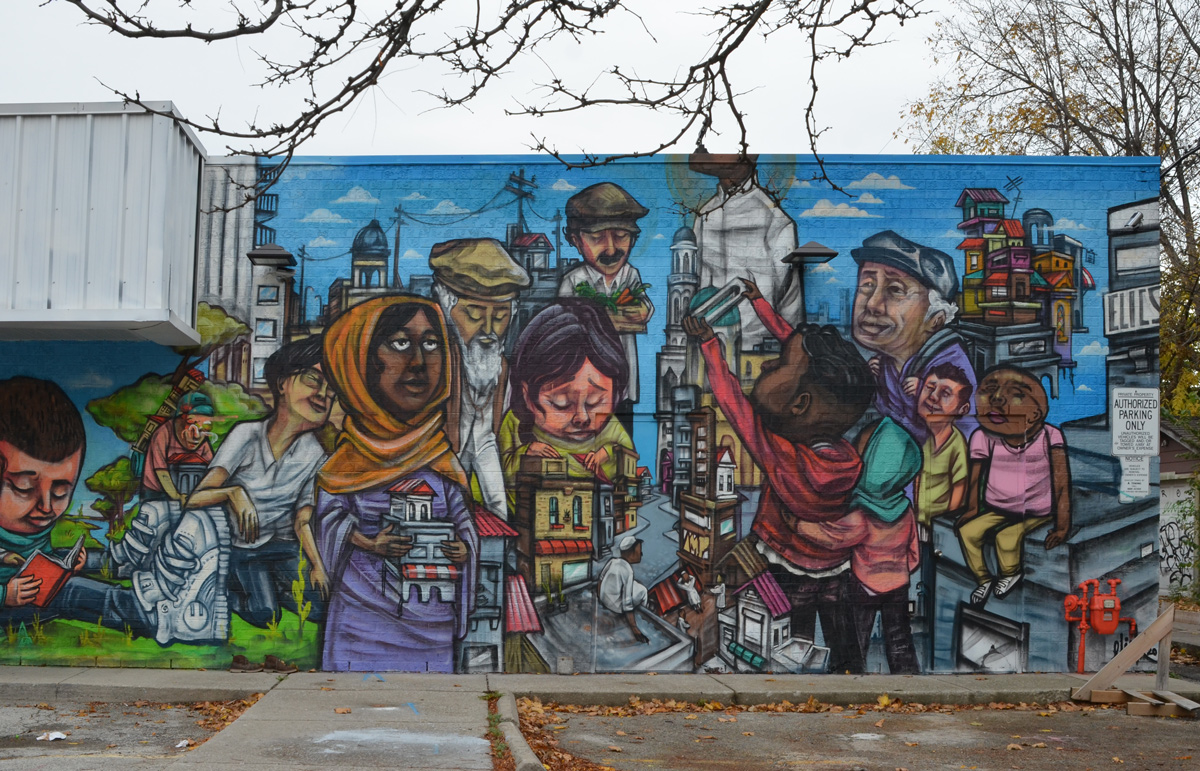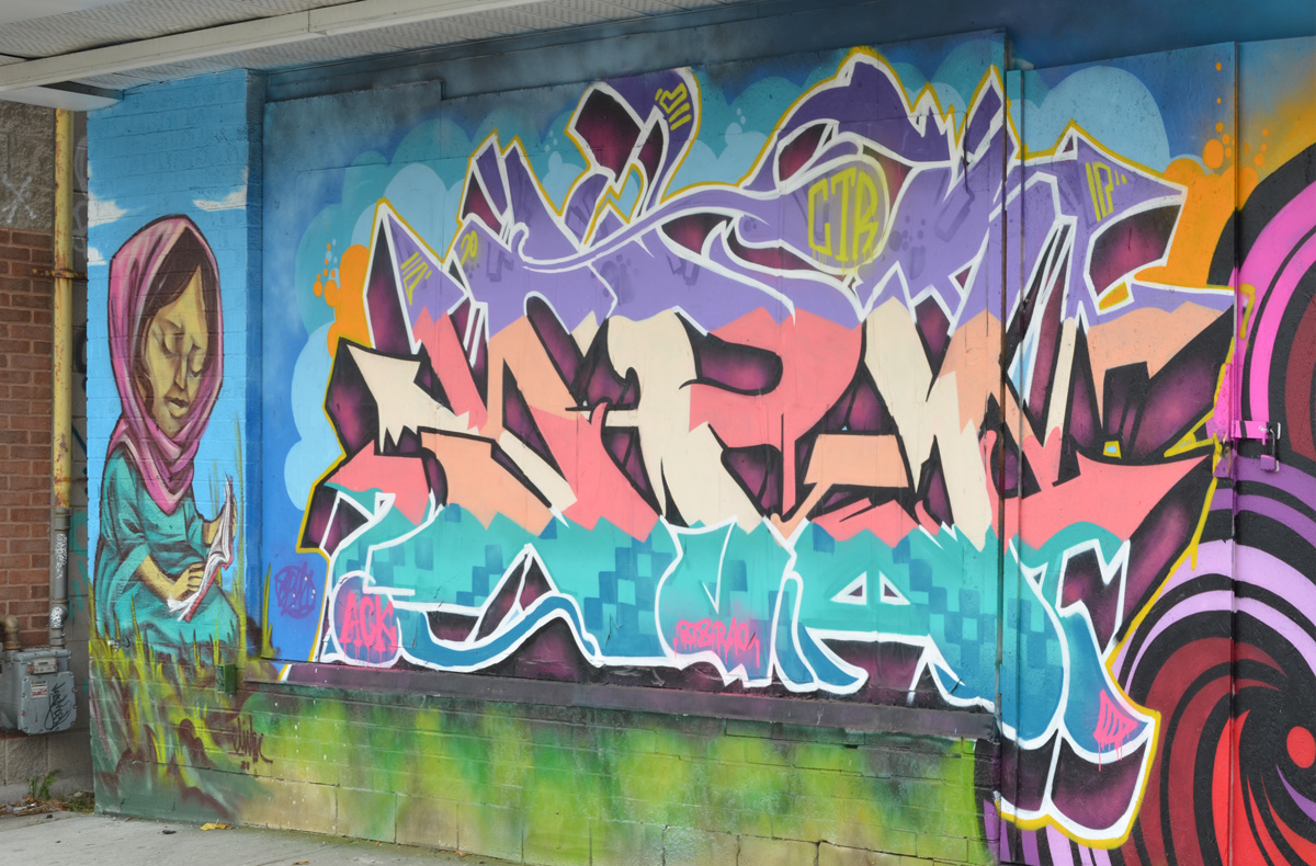 Let’s take a walk around the site, starting by walking east on Eastern Avenue towards Coxwell, south across the park, and then back along Lakeshore. I suggest that you’re sitting down since I tried to cover all the murals and it might take a while!