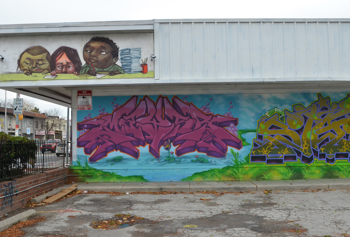 below: Blackbird flying along with the moon in different phases is the work of Natalie Very B. On the right, the wildstyle text-based mural was painted by spud1