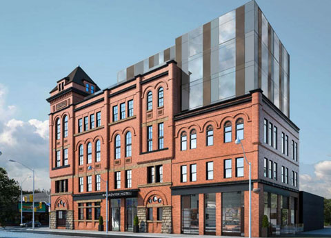 below: Instead, the New Broadview Hotel, built by Streetcar Developments, will have 57 rooms, a rooftop bar and a ground floor restaurant. It will look approximately like this (from Broadview):