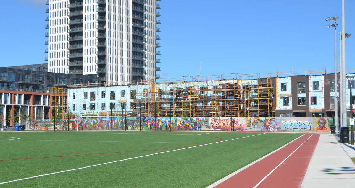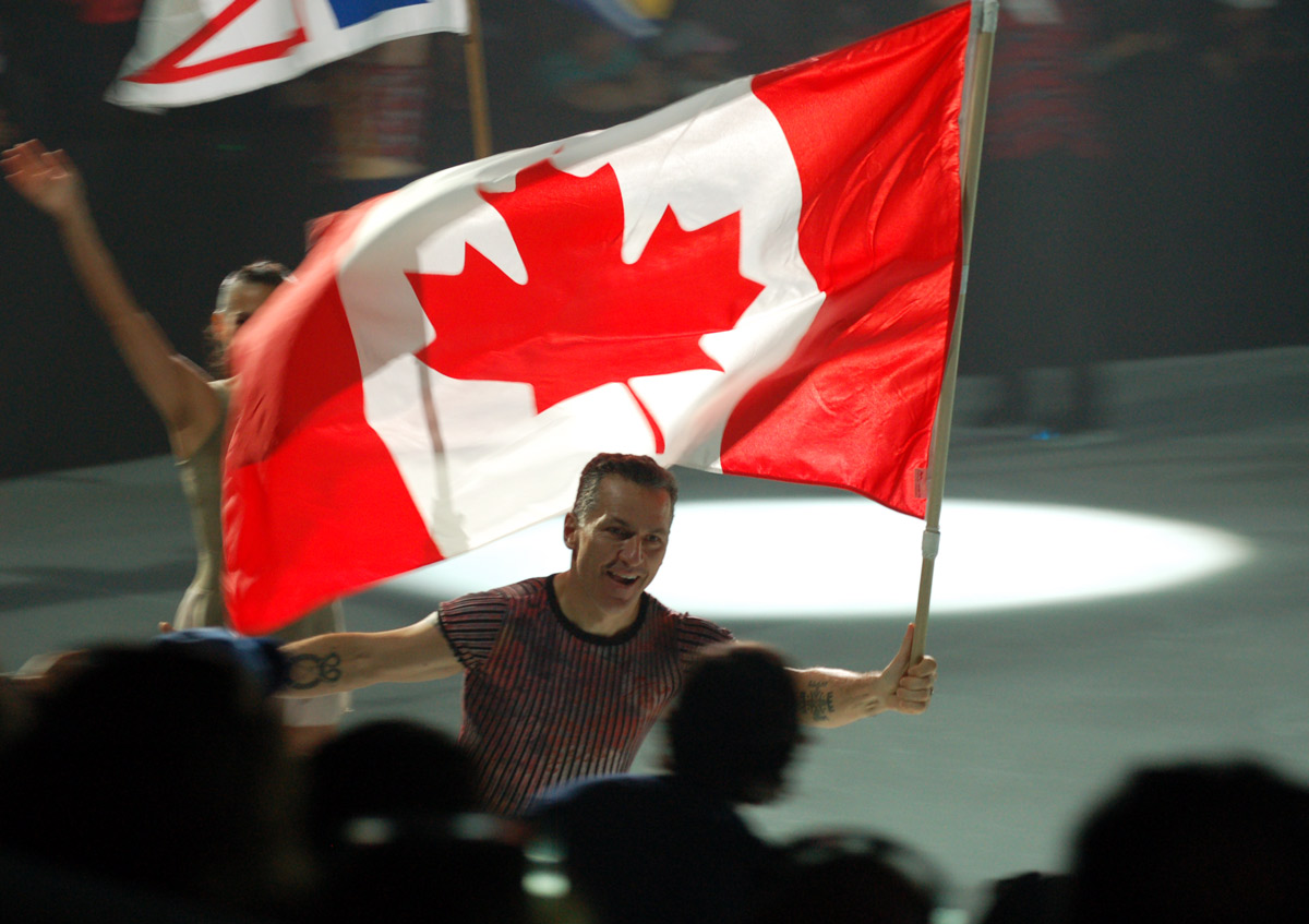 below: Elvis Stoyko carried the Canadian flag at the closing of the ice skating & aerial acrobatics show at the Ricoh Centre.
