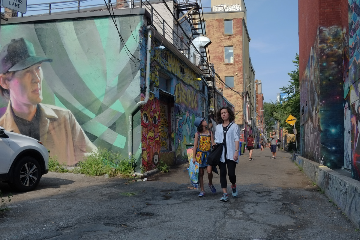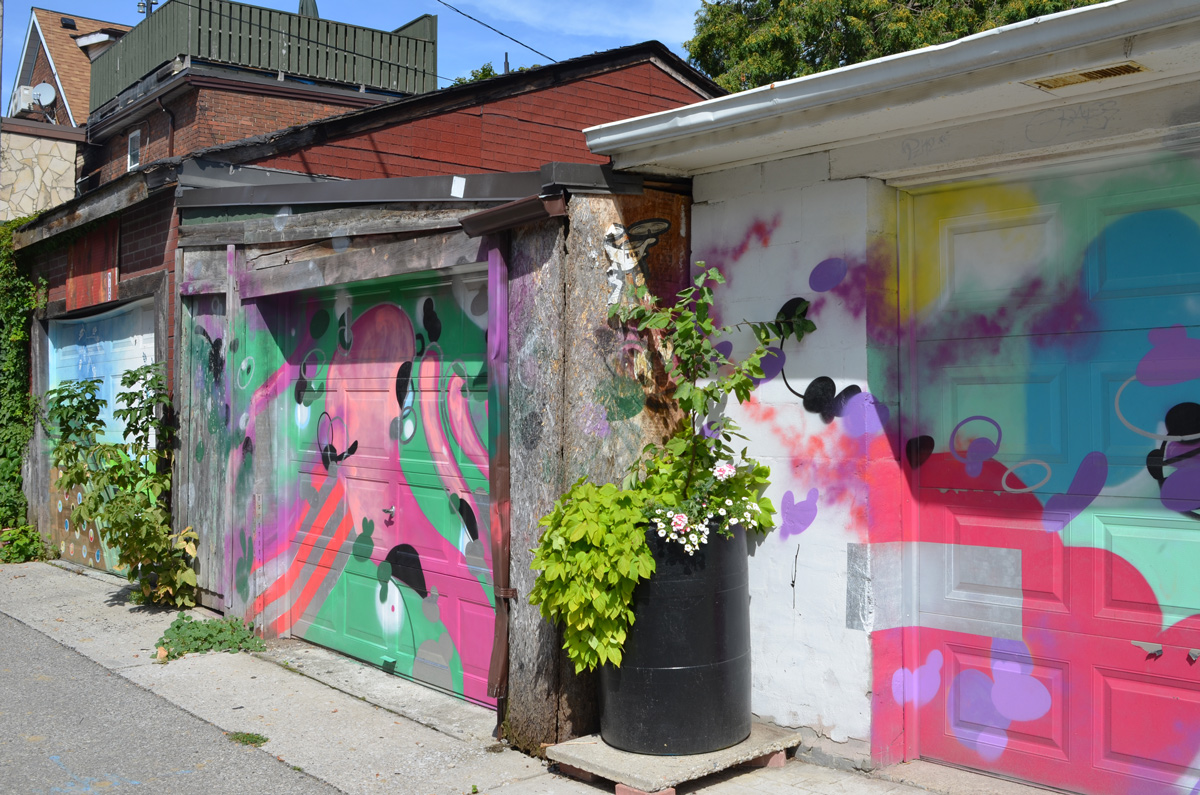 In an alley near Dovercourt and Queen West in Toronto are two unique garage door murals.