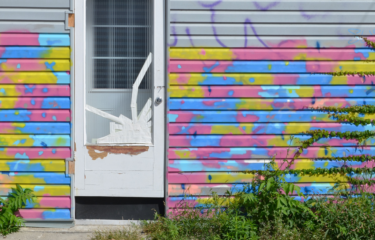 abstract street art on a garage door in a lane, by Pascal Paquette, swirls of colour