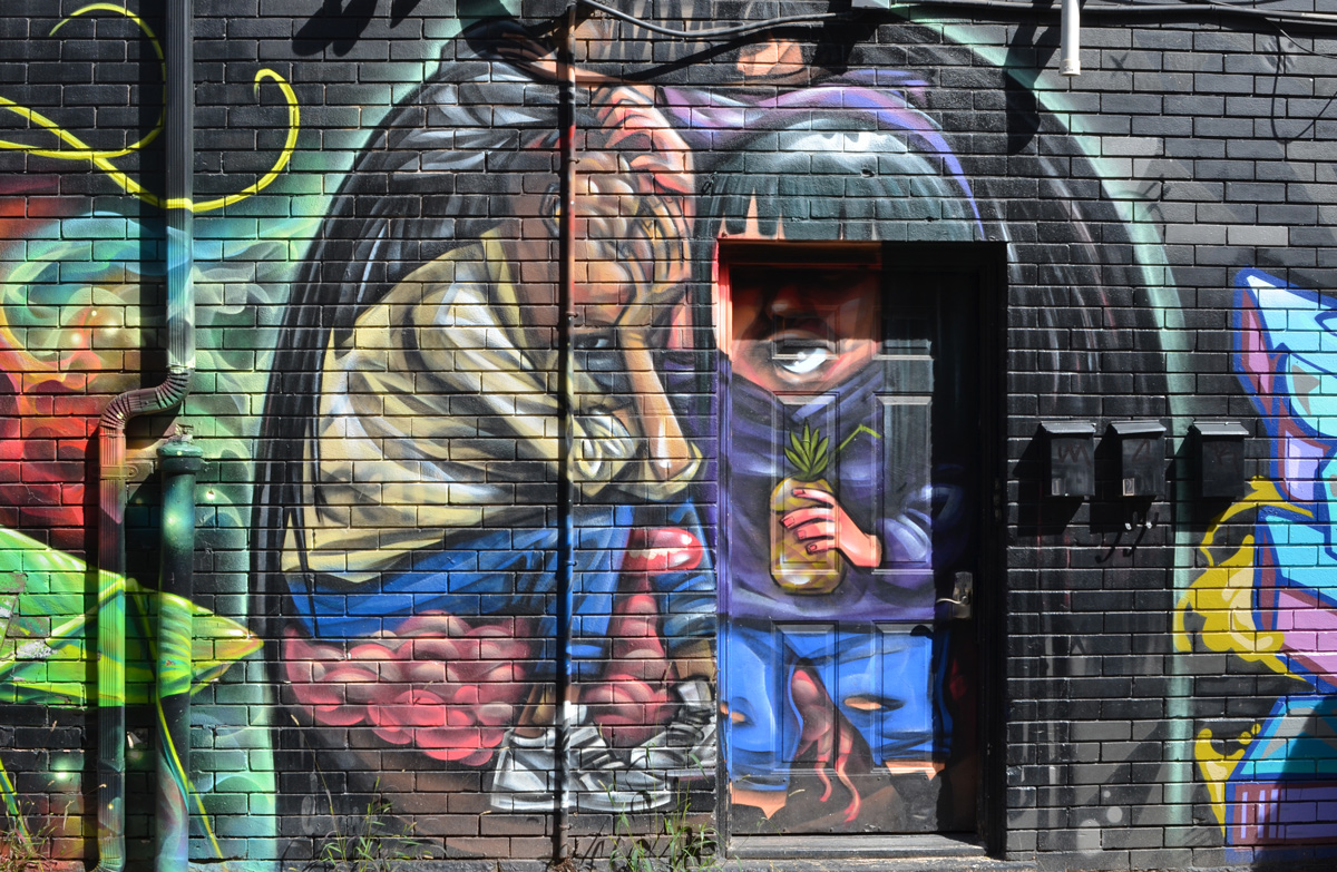 Almost two years ago, inthe fall of 2018, a group of artists brightened up Luttrell Loop Lane with some murals.  Luttrell Loop Lane is on Danforth, just west of Victoria Park.