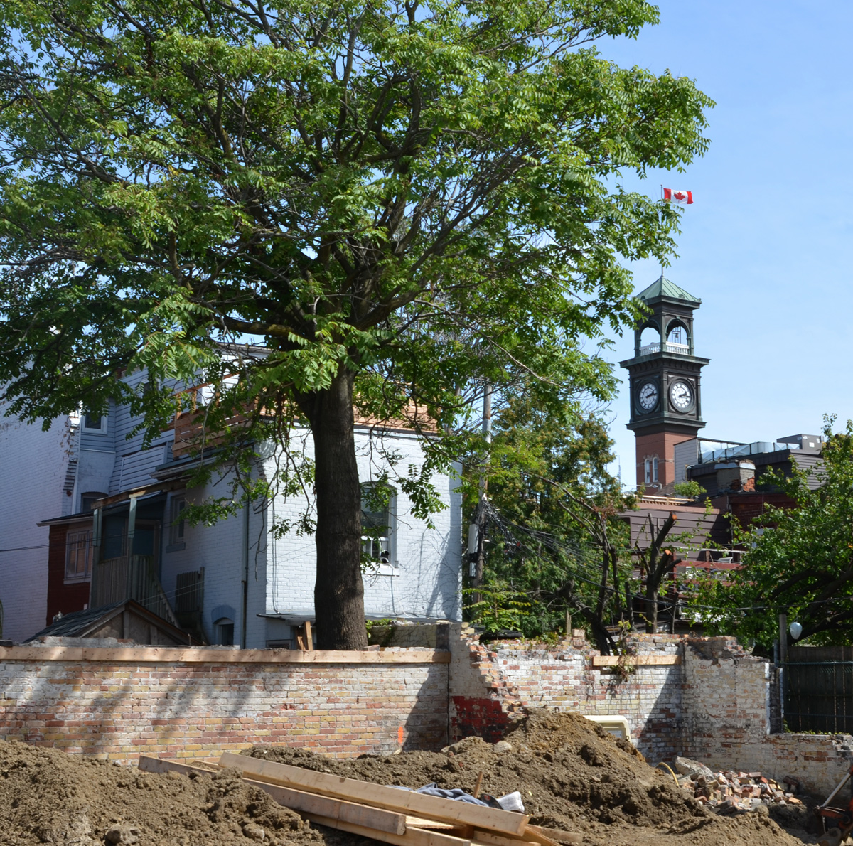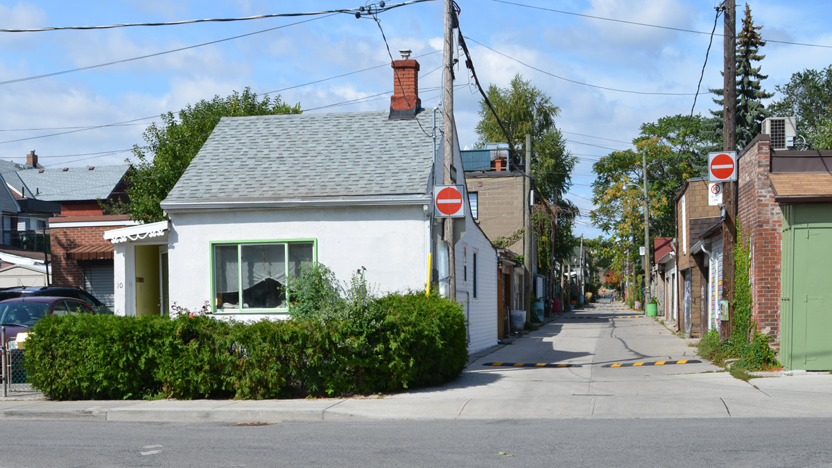 looking down a lane that runs parallel to St. Clair West, with Oakwood Collegiate in the background.