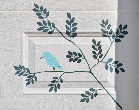 stencil art on a white garage door. greenery, a hummingbird, three swallows in flight, a deer, some red flowers