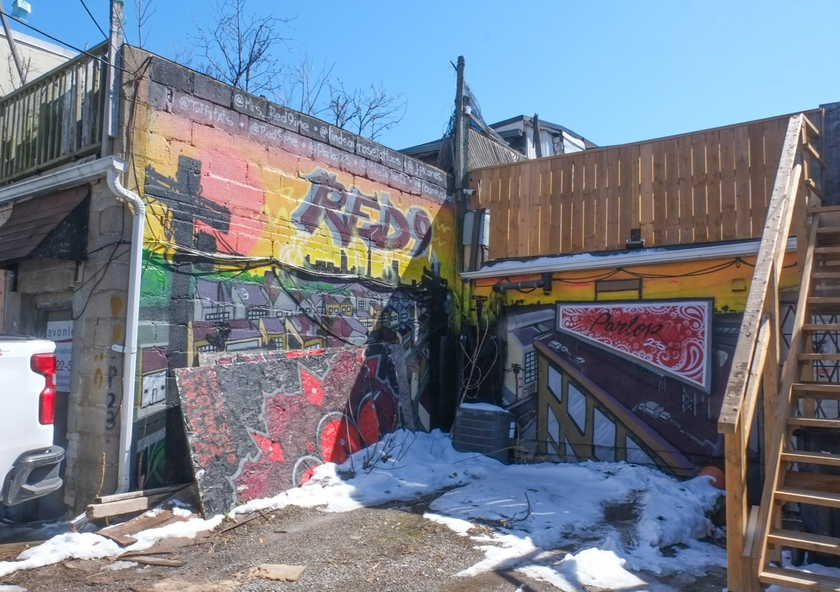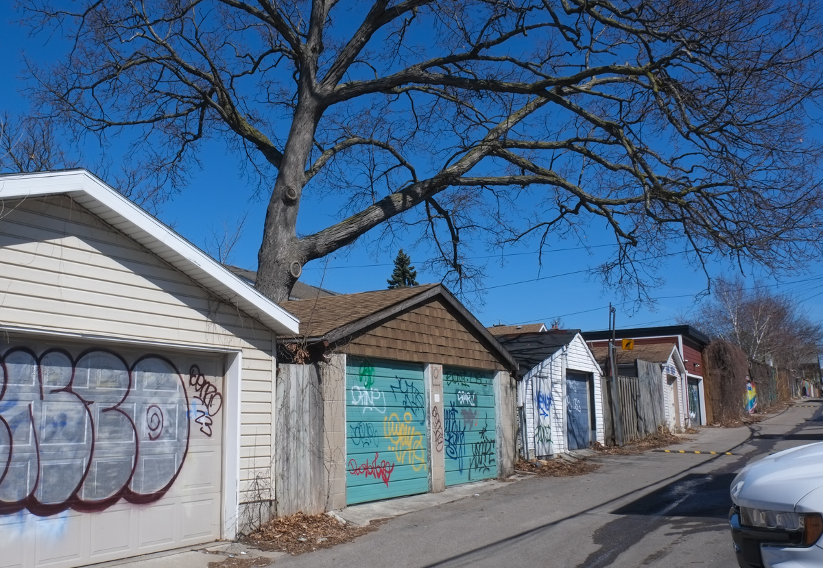 below: A little farther south on Dovercourt I passed this for sale sign. I stopped and took a photo of it because of the words in pink: “Laneway suite potential”. Of course I had to check the lane to see if anyone had built suites back there. Suites, according to the city of Toronto, are rooms built over garages and not stand alone residences.