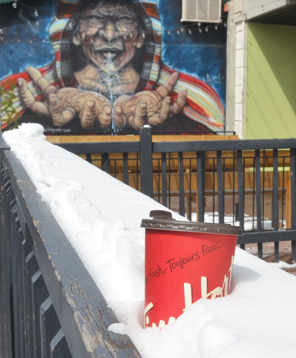 below: ‘Always fresh bread!’ according to the mural on Nova Era bakery… but maybe you see the edge of the blue and white city of Toronto development notice sign peeking into the picture….