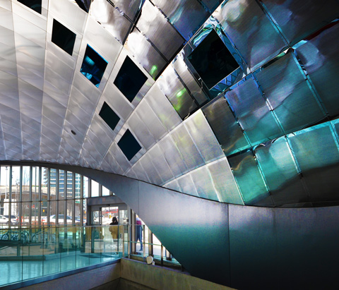 below: The south part of the RBC building is very photogenic! Its gold coloured glass as well as its angles and nooks make for some interesting pictures. The older stone Union Station is hiding in the bottom left corner.