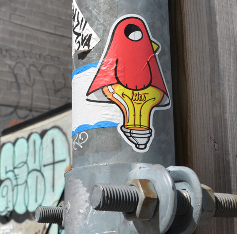 below: A scrawny cat scribbled on yellow paint. In case it is difficult to see, the sticker (or paste up) on the pole is an old television set with text near the bottom that says, “HAHA”. Interpret it as you wish (as usual).