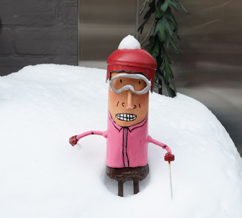 below: Because it was a cold day, some time was spent warming up inside the nearby art galleries. I saw this little ski guy stuck in the snow outside Loch Gallery. Does it look like he’s shivering too? (artwork by Patrick Amiot).