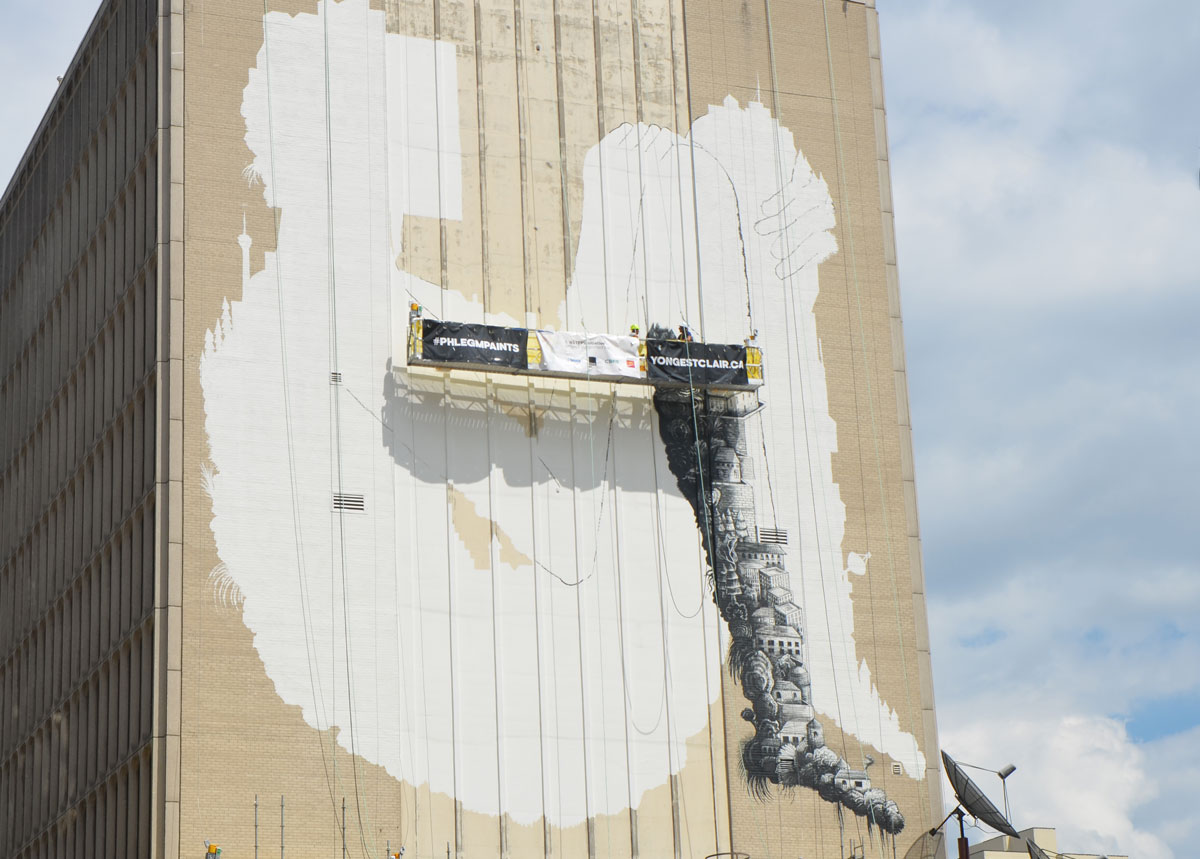 British mural artist Phlegm has been painting a large mural on the side of 1 St. Clair West. The first time I saw it, was on the 14th of July when it looked liked this: