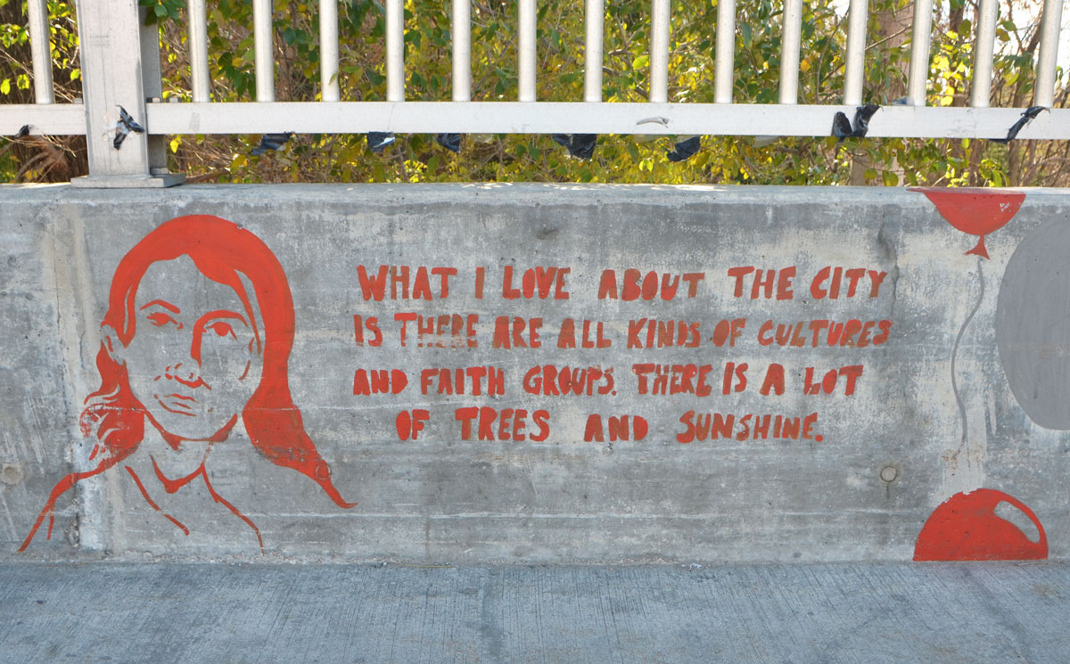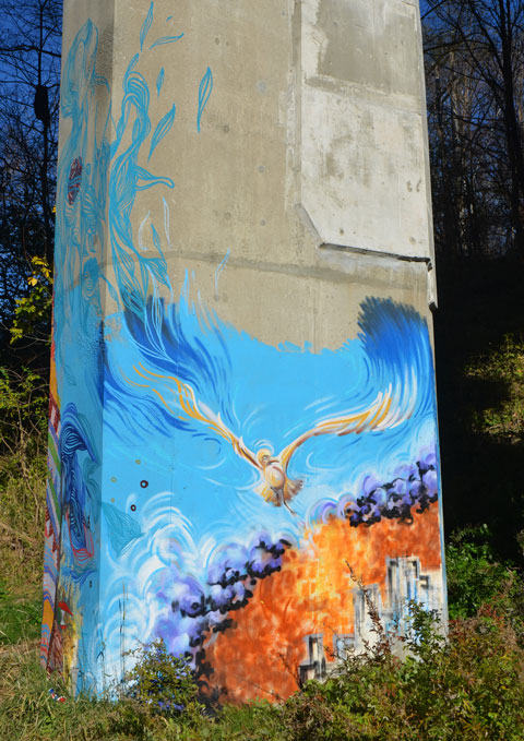 below: Hope takes flight over the city. Unfortunately, it’s hard to see but the word hope is written on the city at the bottom of this small mural but it is behind the weeds.