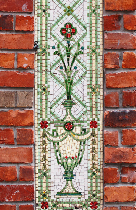 below: Decorative tiles on the front of a brick building on Yonge Street (two photos).