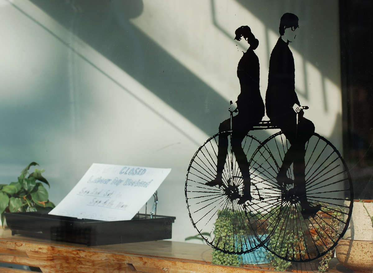 below: It’s not two people each riding an old fashioned bike even though that’s probably the first thing that you think of when you see it. It’s one bike with two wheels and two riders going in different directions. Going nowhere probably. Seen in the front window of Tandem Coffee on King Street East.