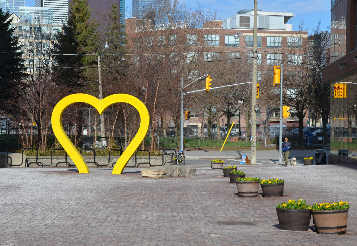 below: When walking past the Gardiner Museum, one can’t help but notice the striped head. It’s actually called ‘Untitled’ (why do artists do that?) and it’s by Jun Kaneko, 2002. It’s made of glazed ceramic and galvanized steel. Before heading underground at Museum subway station I took a few minutes to try to take a ‘pretty’ picture of the head. The plants in the garden next door haven’t quite grown up enough to hide that ghastly table that the head sits on. I have always wondered why the museum chose such a mundane bland platform for the sculpture but now that I look at it again I wonder if it’s possible that the table is actually part of the artwork. Could it be?