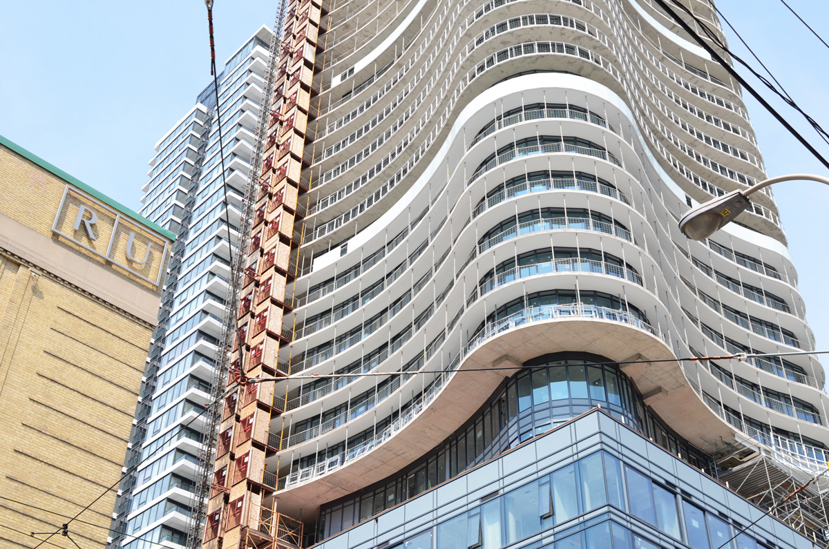 below: A new curvy building rises up on the corner of Carlton and Church. The older building on the left with the R U on the top is the old Maple Leaf Gardens, now part of Ryerson University as well as a large Loblaws.