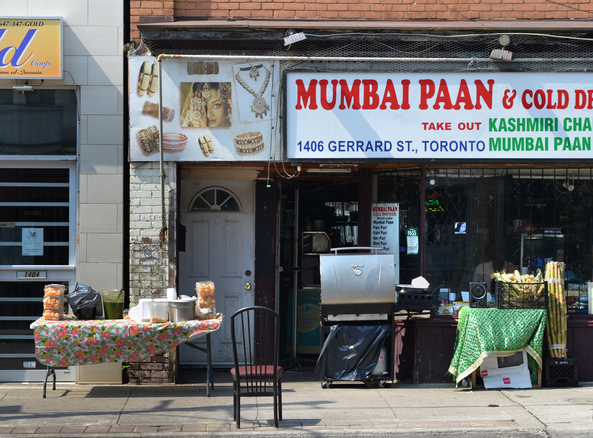 below: After Greenwood, the 506 streetcar passes through Little India before it turns north on Coxwell.