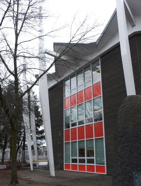 below: Arty metal panels line the south wall of Masaryk-Cowan community center.  Bonar-Parkdale Presbyterian Church is in the background.