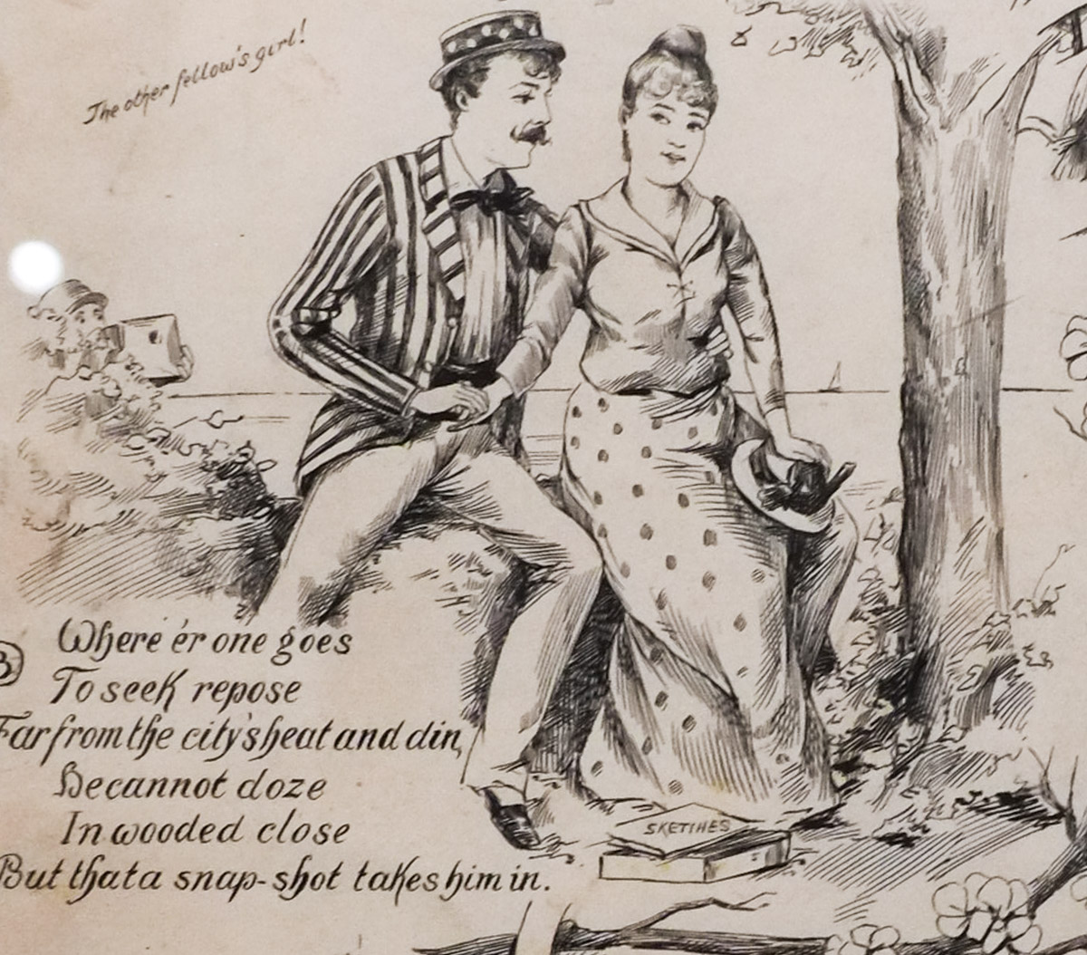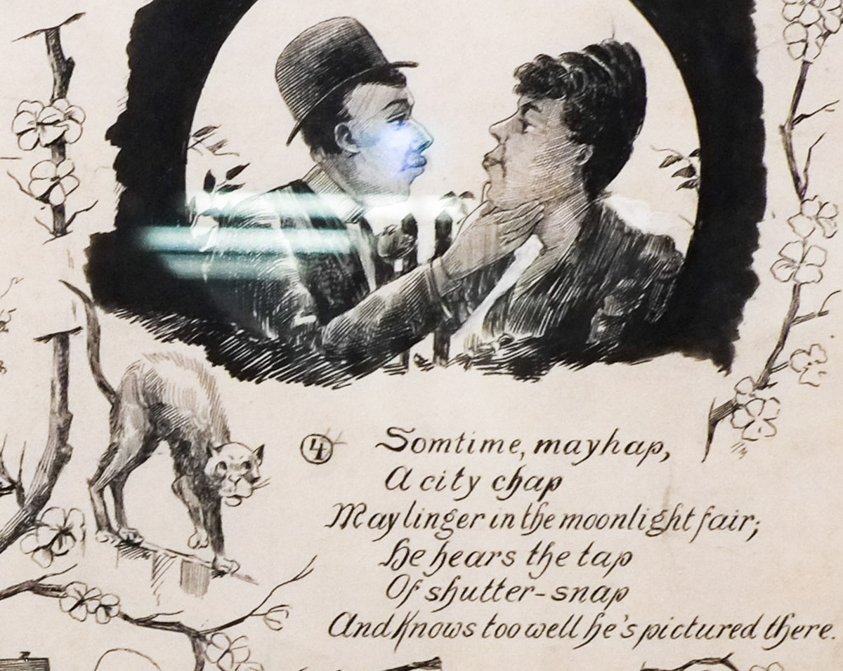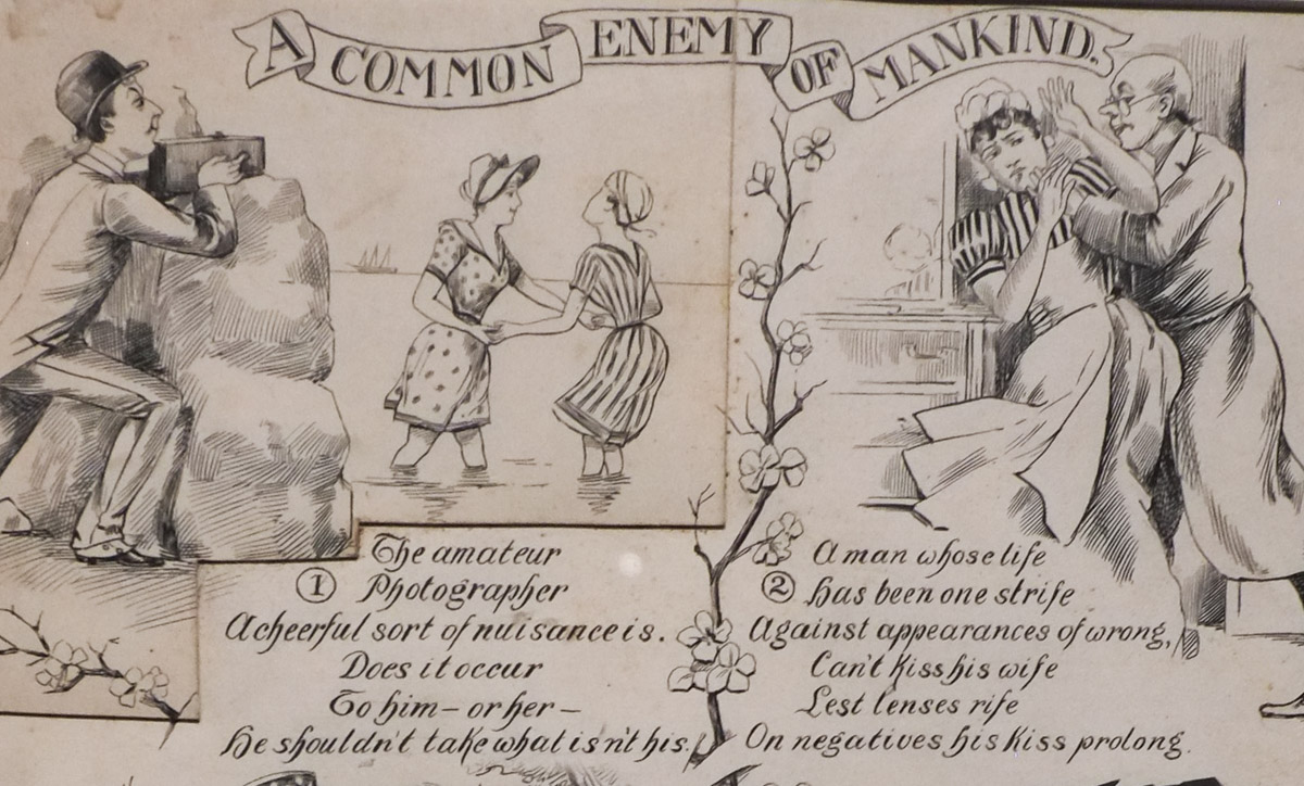 One of the pieces on display at TMU’s The Image Centre is this is pen and ink drawing signed by “Fun & Borckmann” from about 1895. It is part of the exhibit, “Hypervisibility: Early Photography and Privacy in North America, 1839-1900.” The drawing is on loan from the collection of Stephen Bulgar and Catherine Lash. As you can see, across the top is the title, “A Common Enemy of Mankind”. If you start at the first panel on the top left, you might think it is etiquette suggestions for photographers, but on closer inspection, is it?