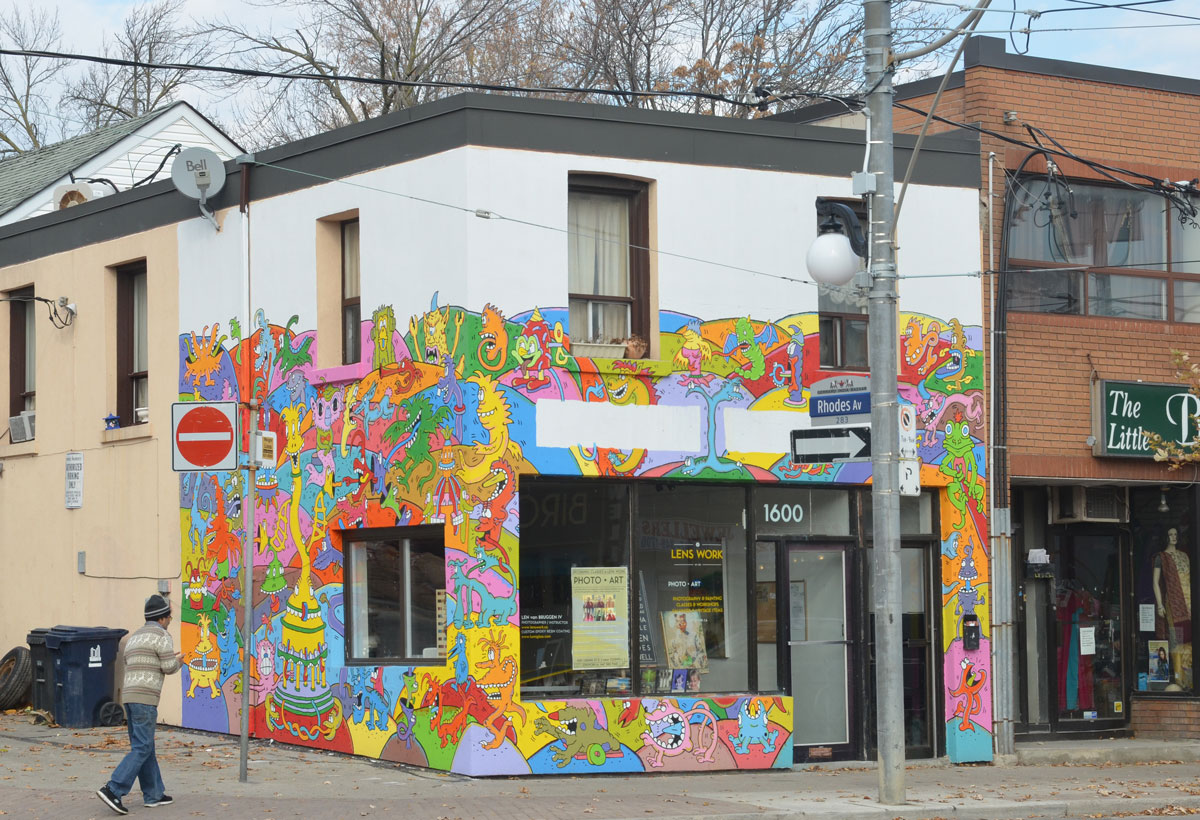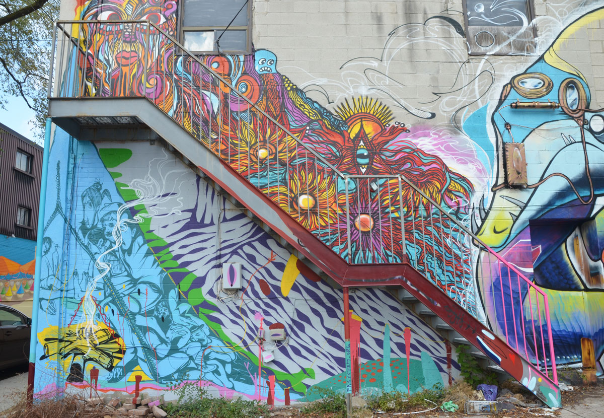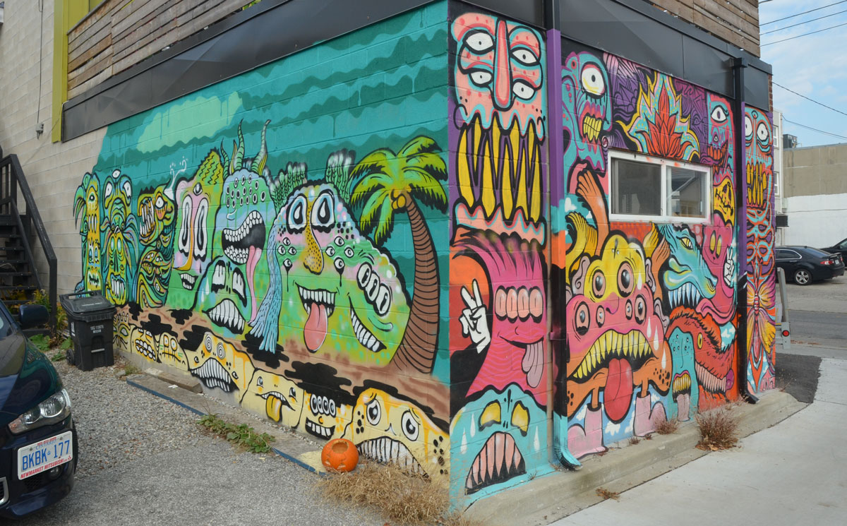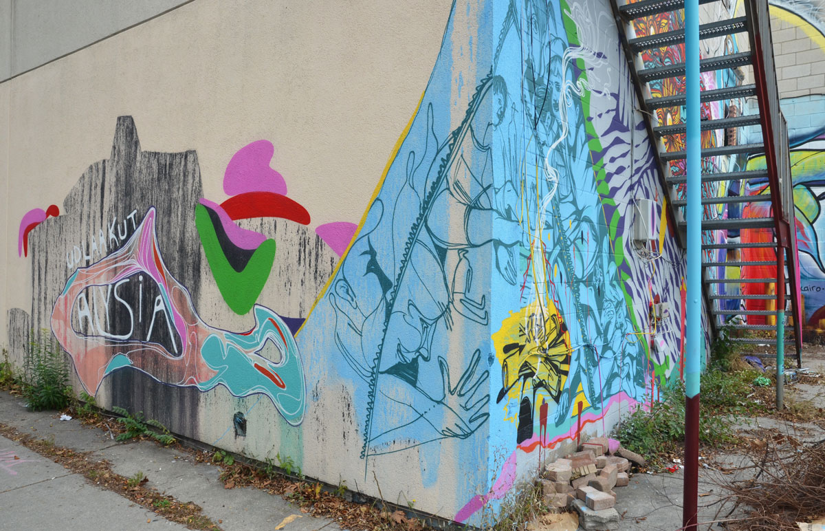 Women in the Walls was/is a mural project where most of the painting was done on the last weekend in August. Twenty women participated to create murals in the alley behind the north side of Gerrard Street East near Craven, Rhodes and Woodfield. One van and one car were also painted.
