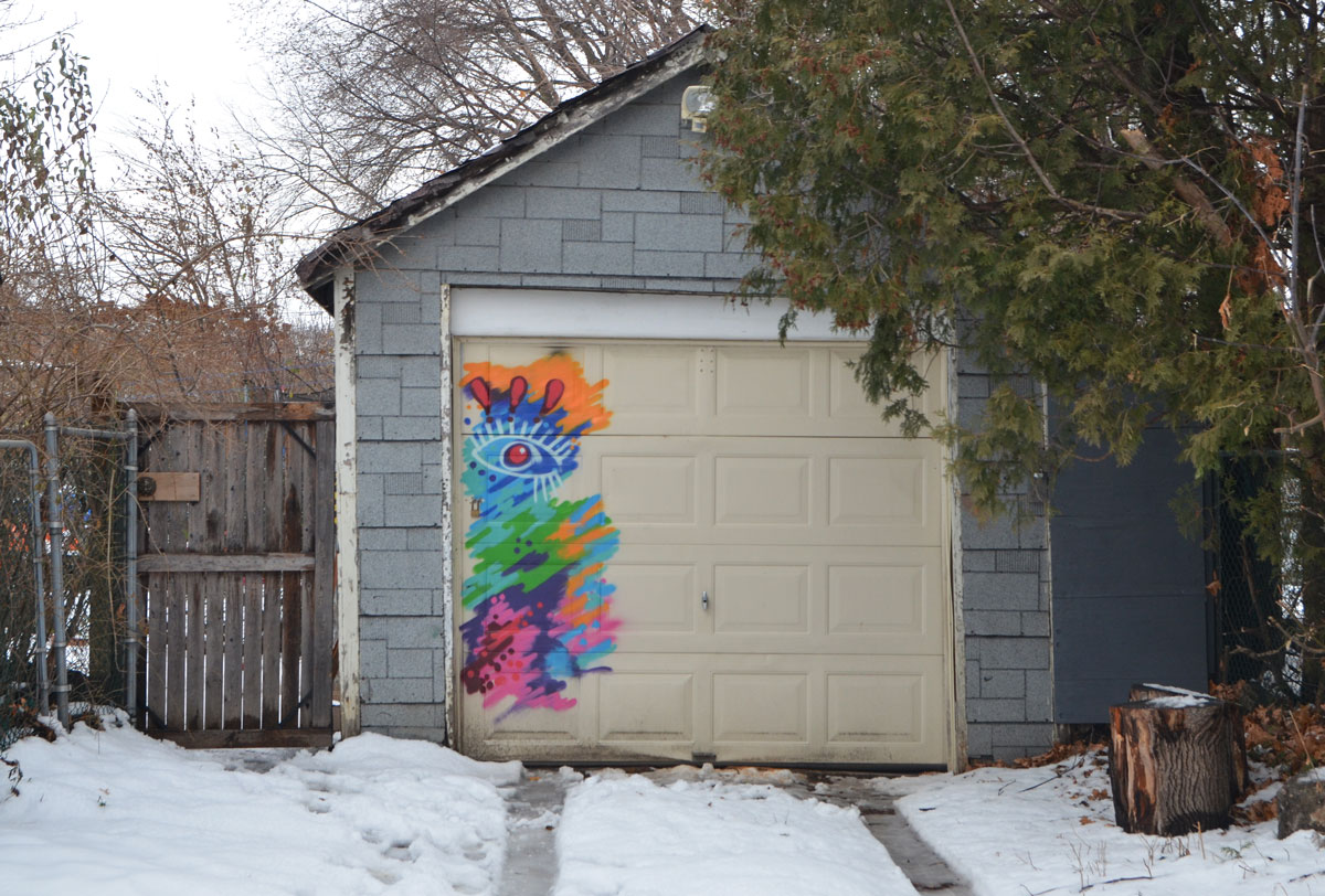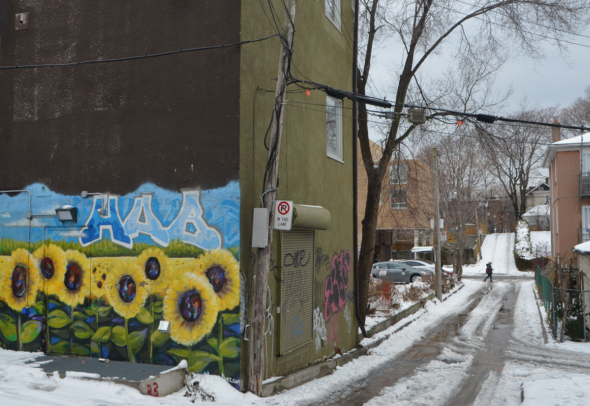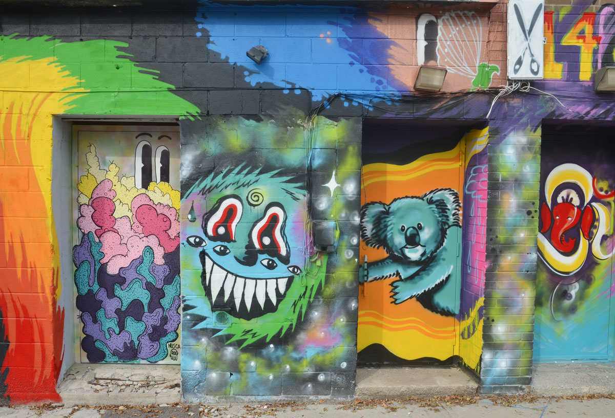 Women in the Walls was/is a mural project where most of the painting was done on the last weekend in August. Twenty women participated to create murals in the alley behind the north side of Gerrard Street East near Craven, Rhodes and Woodfield. One van and one car were also painted.