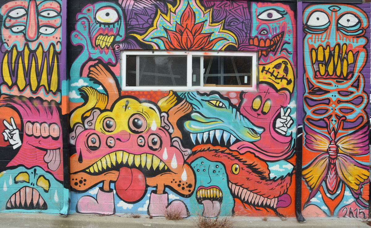 below: Up close to the central portion of a mural painted by Chief Ladybird and Auralast.