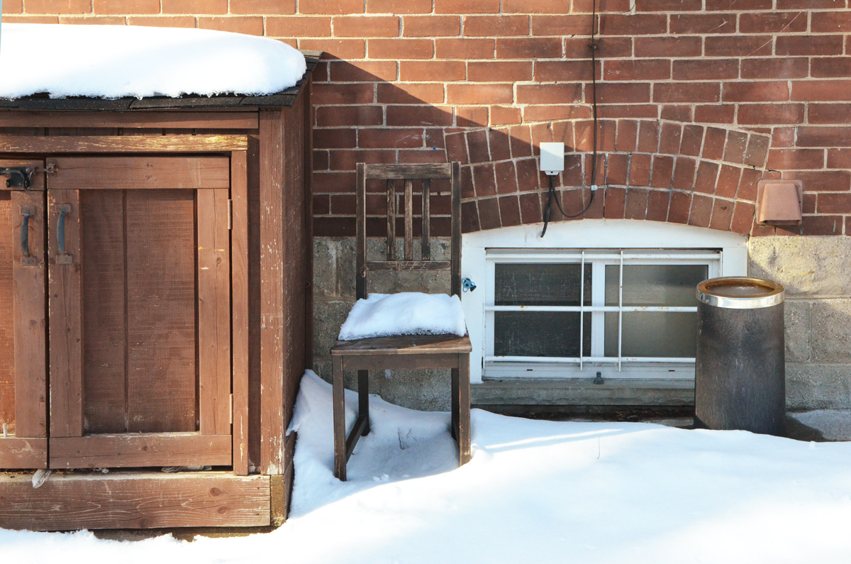 door in an alley with a chair in front of it as well as bags of garbage and two bright red and yellow cushions