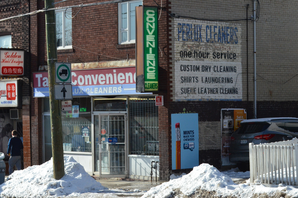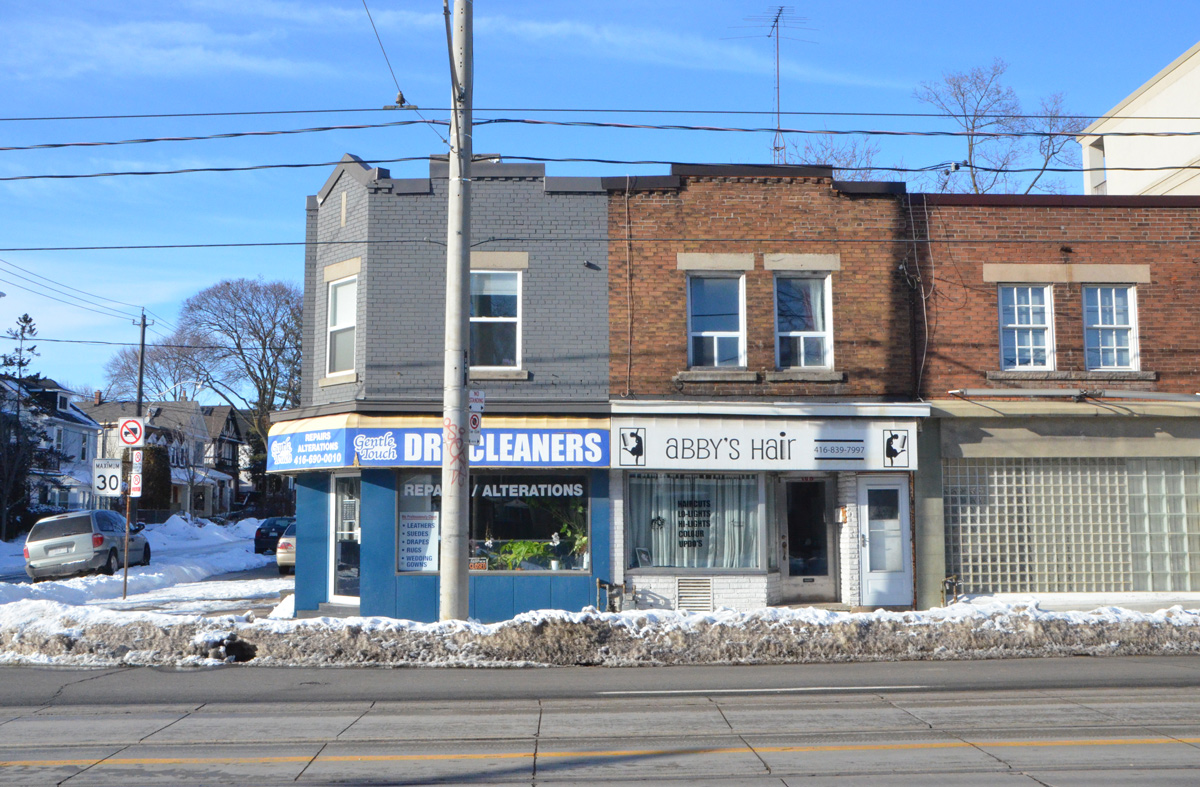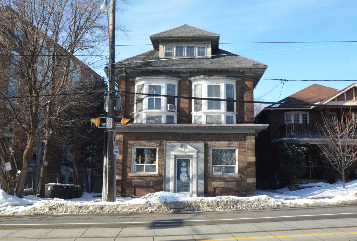 three storey red brick building on corner of college and dovercourt, northeast corner, stores on the lower leve, traffic lights, utility poles and streetcar wires