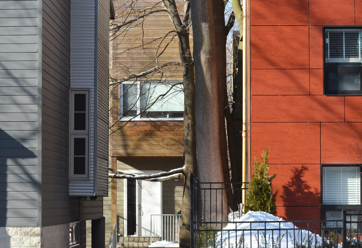 looking down an alley to the back of a triplex (three storeys high) with fire escape stairs and balconies with railings