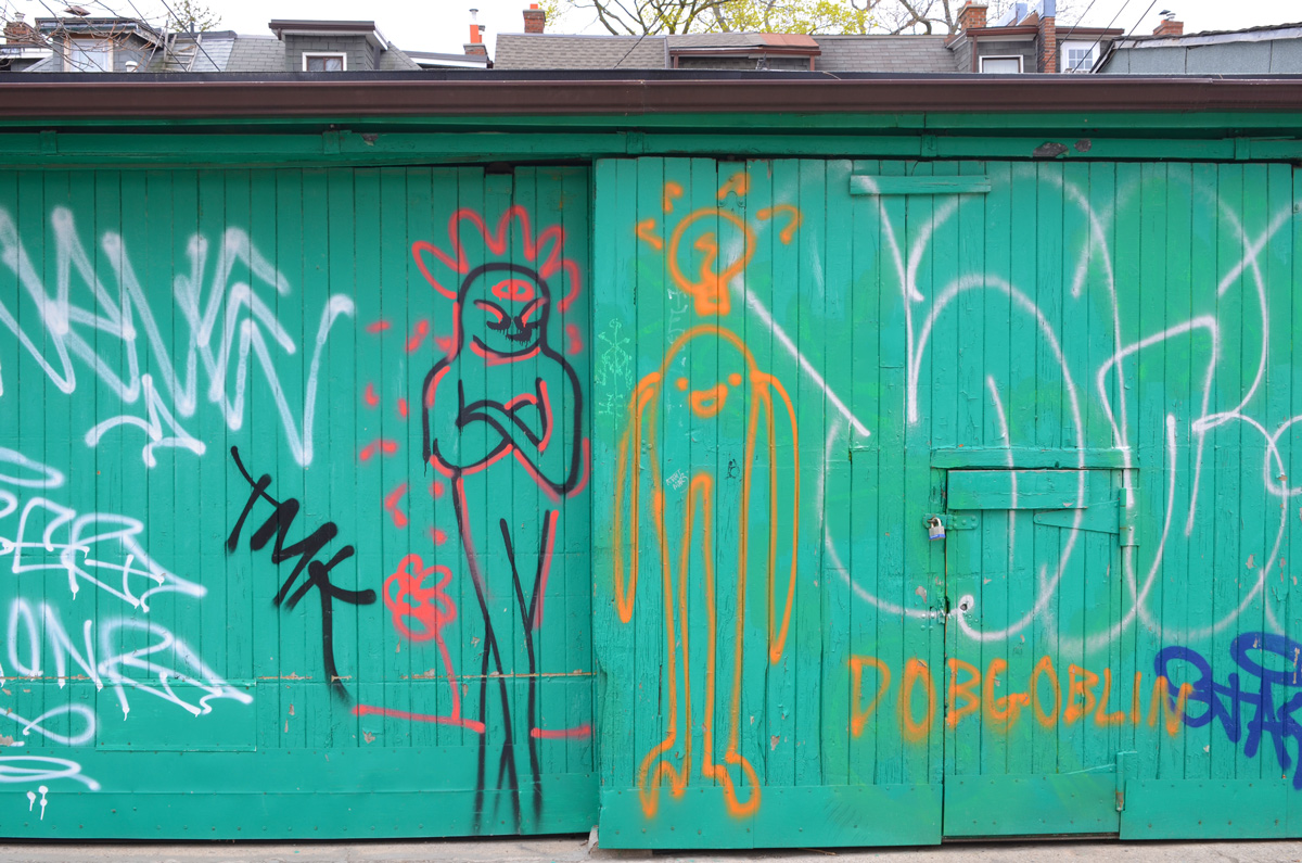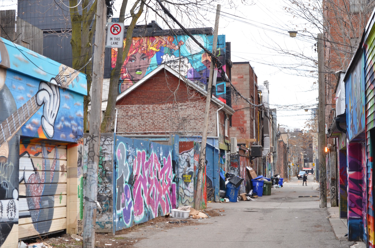 Most people who visit Graffiti Alley don’t realize that there is another section of street art to the west.   Technically, Graffiti Alley is the lane behind the south side of Queen Street West between Spadina and Augusta.  The next section of the alley, from Augusta to Portland, is Rush Lane.   Unfortunately there is a large Loblaws/Winners that blocks the lane on the west side of Portland.