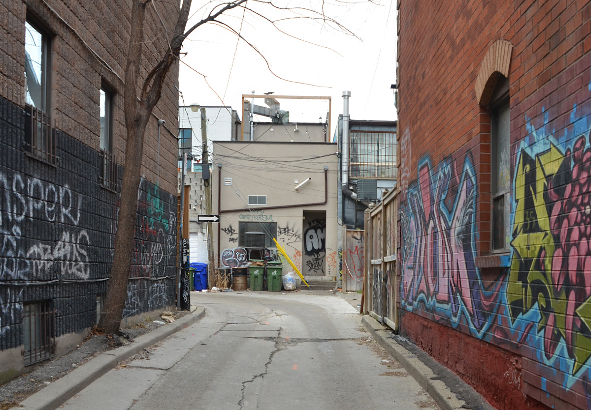 below: Between here and Bathurst Street, a lot of street art has disappeared as redevelopment of Richmond has progressed.  The large black building on the right has its garage entrance from the lane so watch for cars when you’re back there.