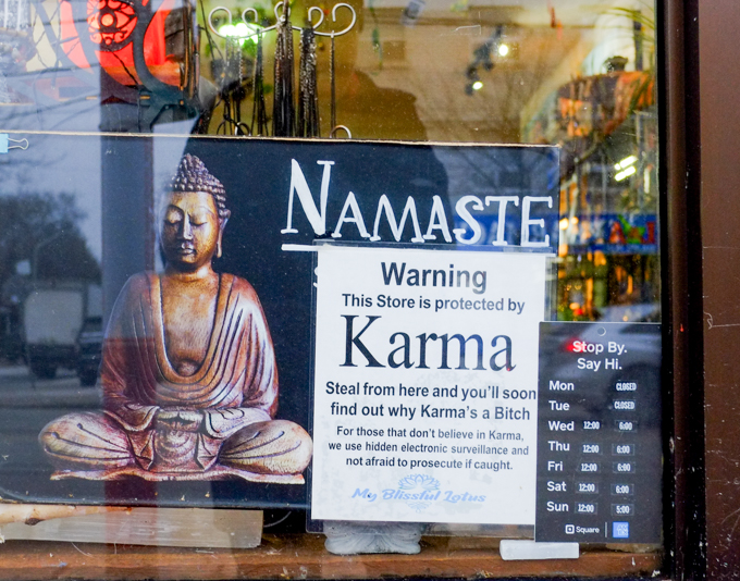 below: “Namaste! Warning, This Store is protected by Karma. Steal from here and you’ll soon find out why Karma’s a Bitch.”