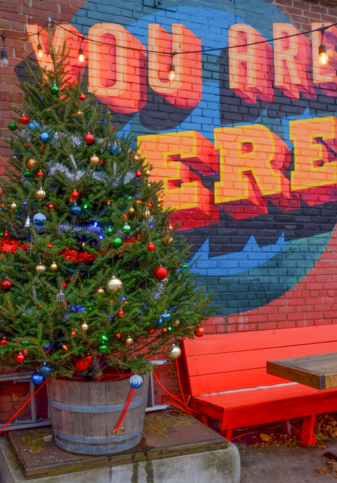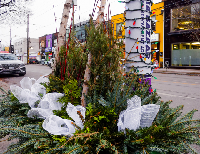 below: Christmas lights on poles, and greenery with bows – it must be December in the city!