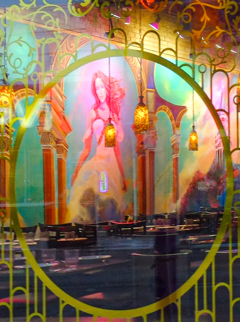 below: Rana Gems, India Paan, and a restaurant with tacos and mariscos (seafood, en español) as well as a Christmas tree in the window.