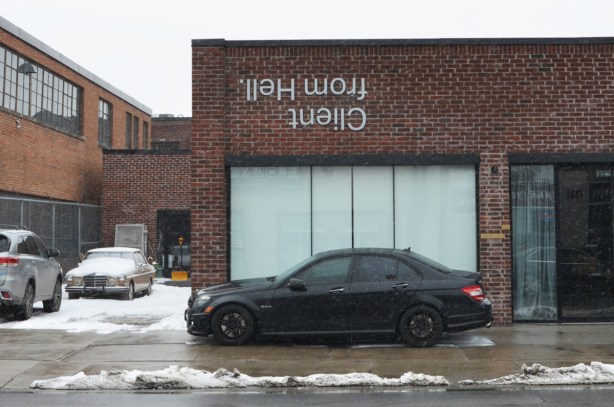 below: This strange pillar (artwork?) is on the southwest corner of Dufferin and Dupont. It used to be the marker/sign for the stores in the Galleria plaza on that corner. Everything there is under renovation at the moment so instead of tearing down the sign, it was converted into this. Hence, “Love me till I’m me again”.