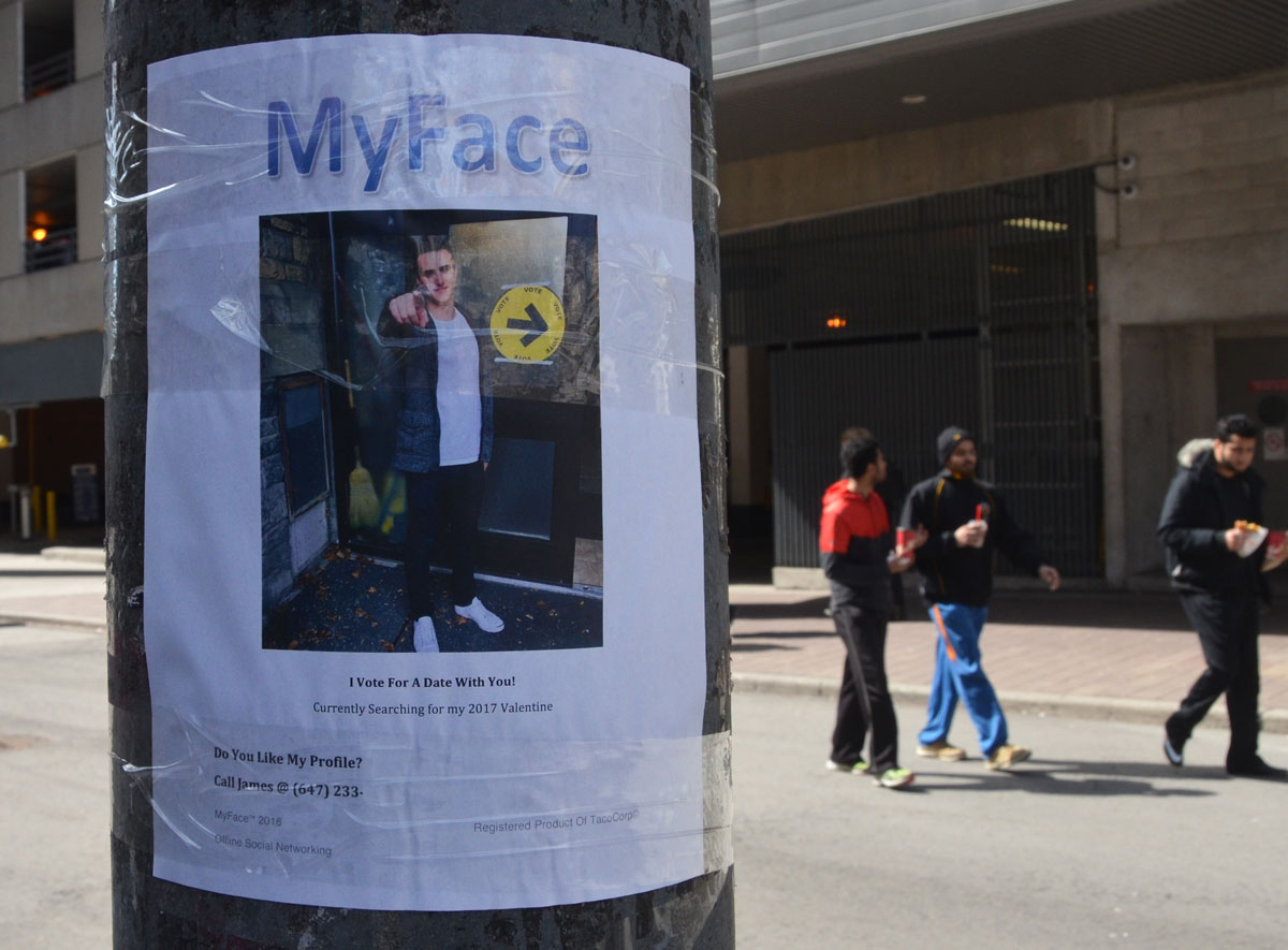a poster taped to a pole on a street with the heading "MyFace", a picture of a young man pointing at the camera. Words on the bottom say: