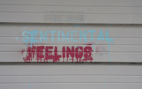 graffiti words stenciled on a garage door that say sentimental feelings.