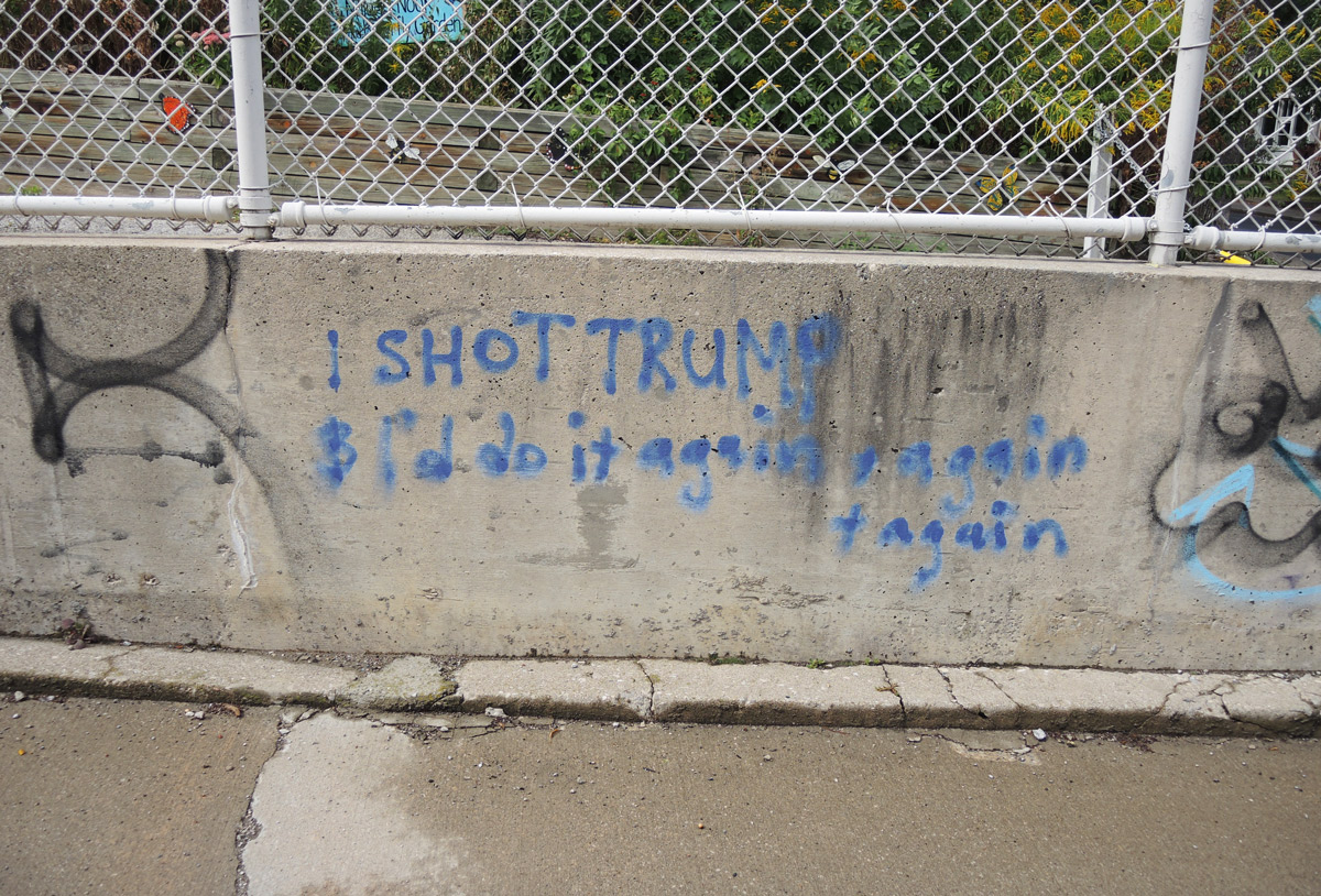 blue spray paint graffiti words on concrete by a chainlink fence surrounding a school playground and parking lot that say I shot Trump and I'd do it again and again and again
