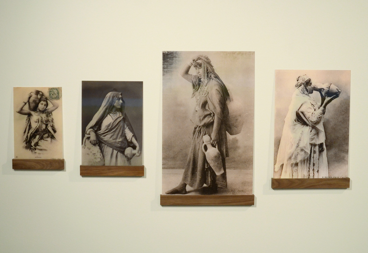 below: Leila Fatemi has centered her exhibit around vintage postcards of Muslim women. Here they are printed such that the image depends on the angle from which you view the picture.